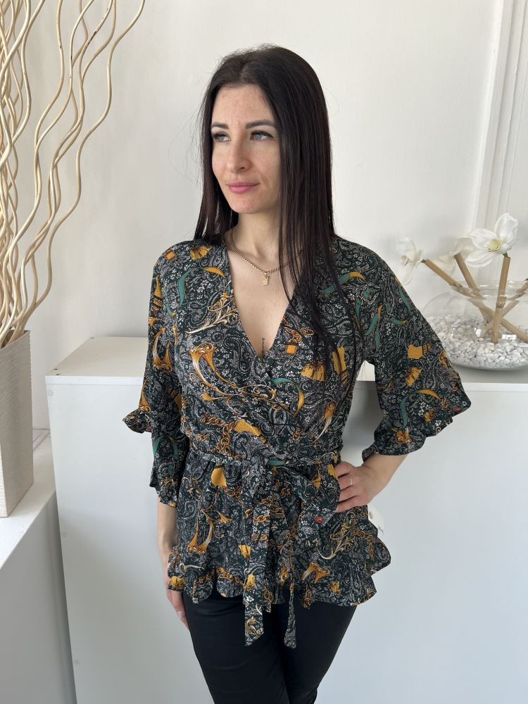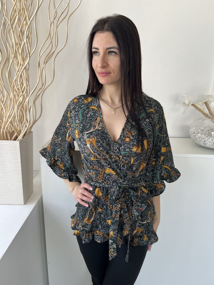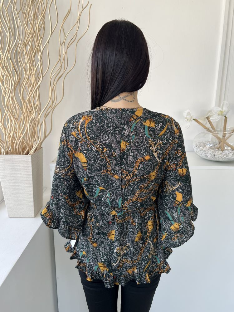 AX (M) Sötétzöld Színes Mintás, Derékban Megkötős Gumisderekú, Fodros Szegélyű Felső