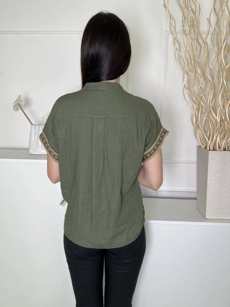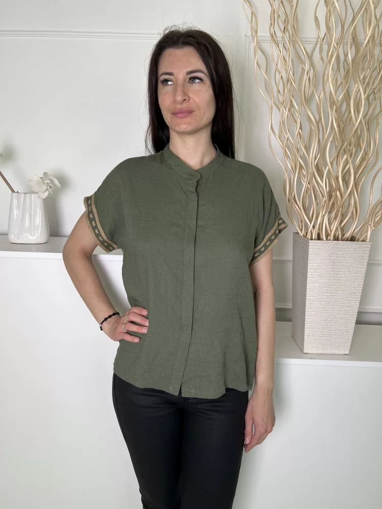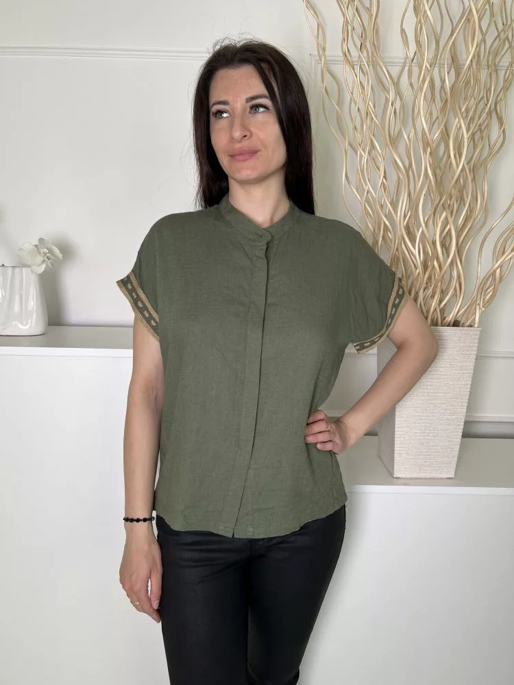 Aggél (M) Zöld Elől Rejtett Gombos, Ujjvégén Arany Díszes 25% Len Alapanyagú Felső