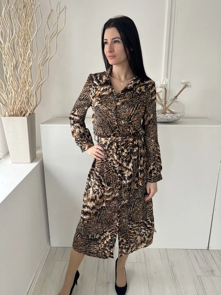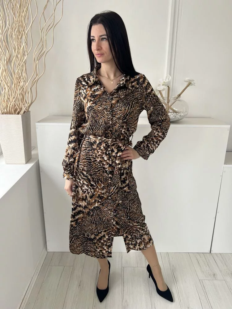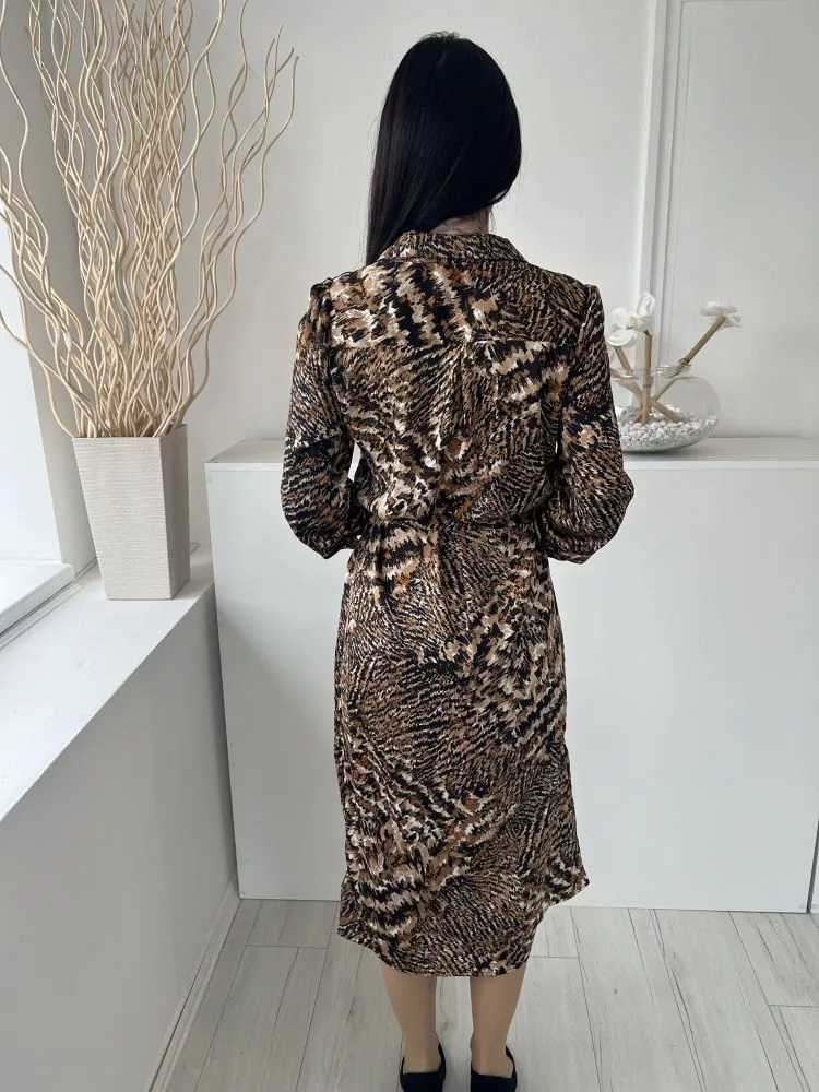 Akos (M) Barna Mintás, Elől Végig Gombos Derékban Megkötős, Galléros Ruha