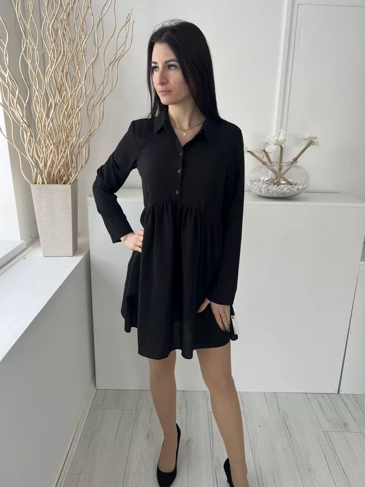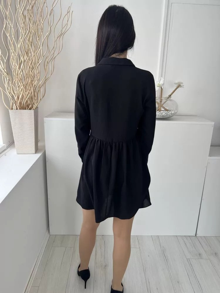 Asos (M) Fekete Mellnél Gombos, Derékban Ráncolt Fodros Aljú, Galléros Ruha