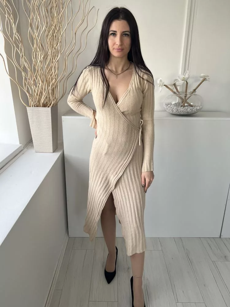 Asos (XS) Homokszínű Anyagában Bordázott, Átlapolt Oldalt Megkötős, Kötött Ruha