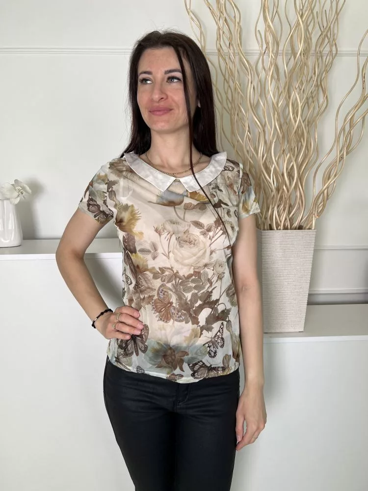 Atmosphere (M) Zöld Növénymintás, Átettsző Galléros, Hátul Nyakban Gombos Felső