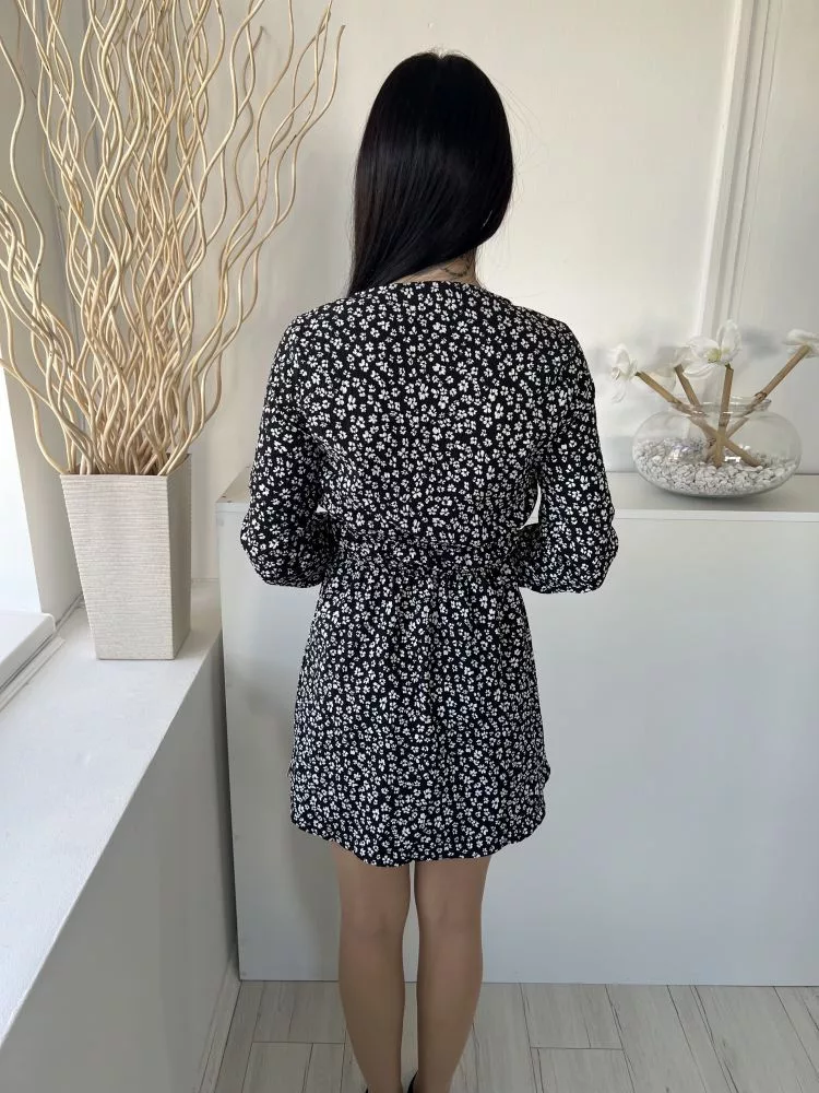 Bershka (M) Fekete Apró Virágos, Gumisderekú V Kivágású, Gumis Ujjvégű Ruha