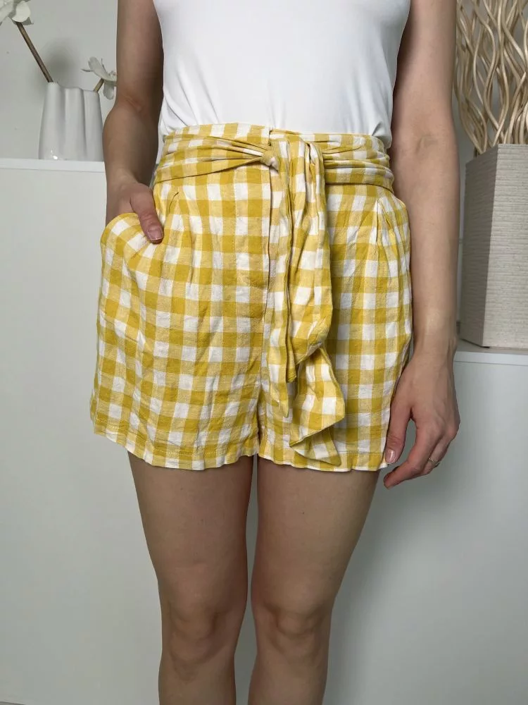 Bershka (S) Sárga Fehér Kockás, Hátul Gumisderekú, 43% Len Derékban Megkötős, Zsebes Rövidnadrág