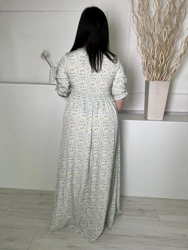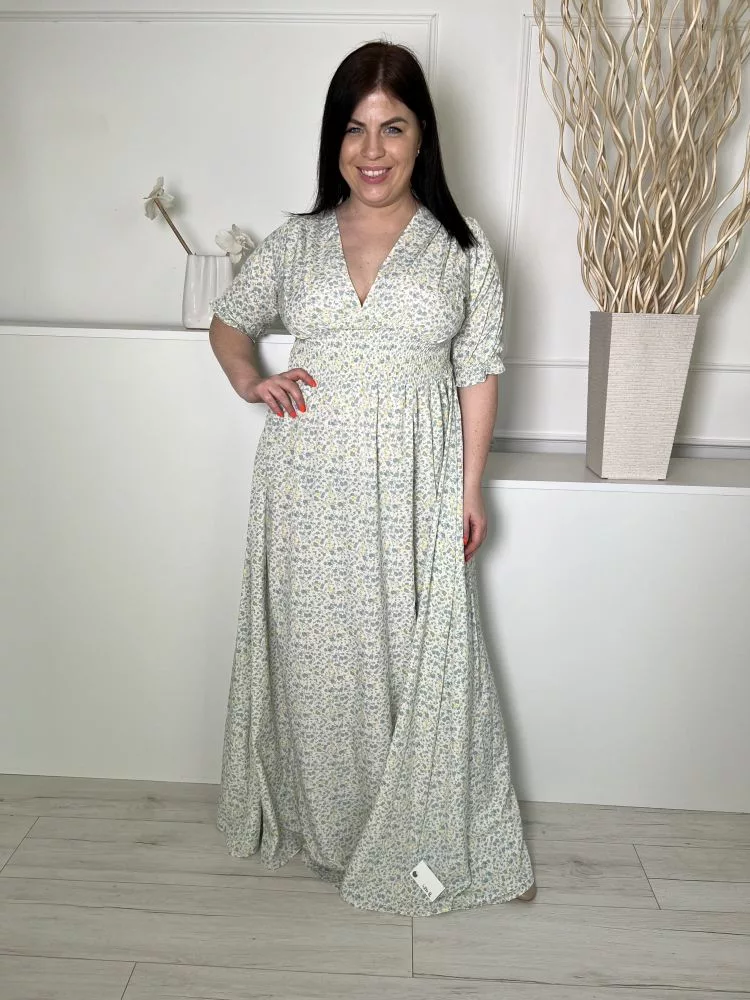 Boohoo (M) Fehér Kék-Sárga Apró Virágos, Derékban Darázsolt Fodros Ujjvégű, Oldalt Cipzáros Ruha