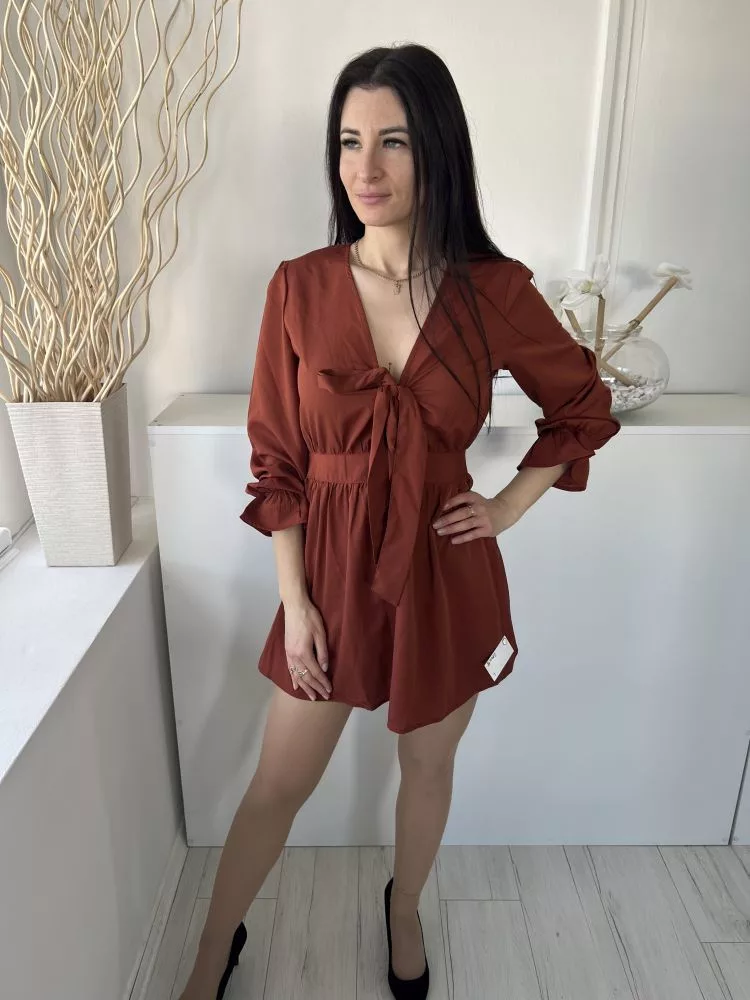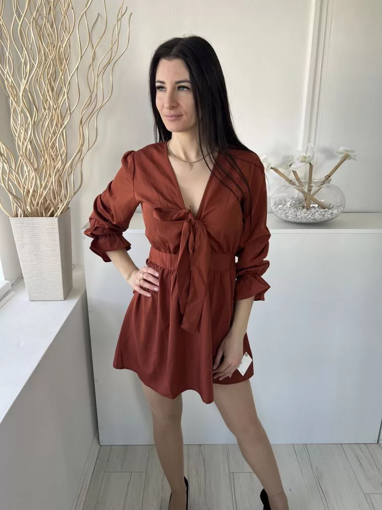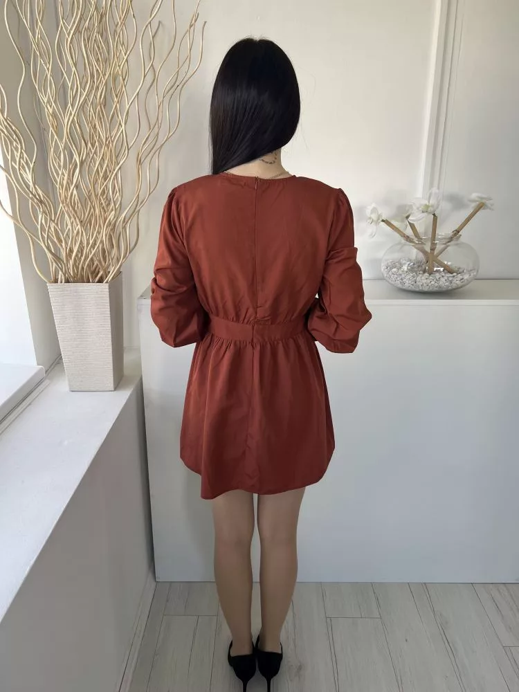 Boohoo (M) Rozsdabarna Mellnél Megkötős, Hátul Cipzáros Fodros Ujjú Ruha