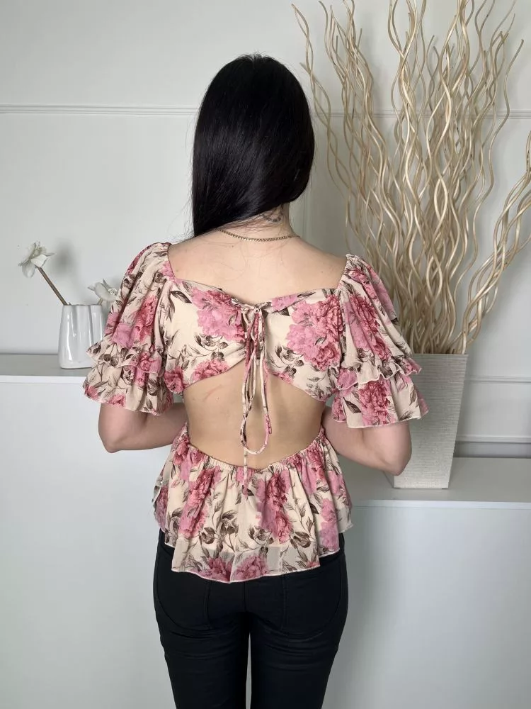 Boohoo (M) Világosbarna Rózsaszín Virágos, Gumírozott Vállú Hátul Nyitott, Fűzős Felső