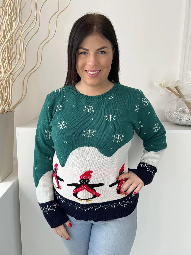 Boohoo (M) Zöldeskék-Fehér Hópehely és Pingvin Mintás Kerek Nyakú, Kötött Pulóver