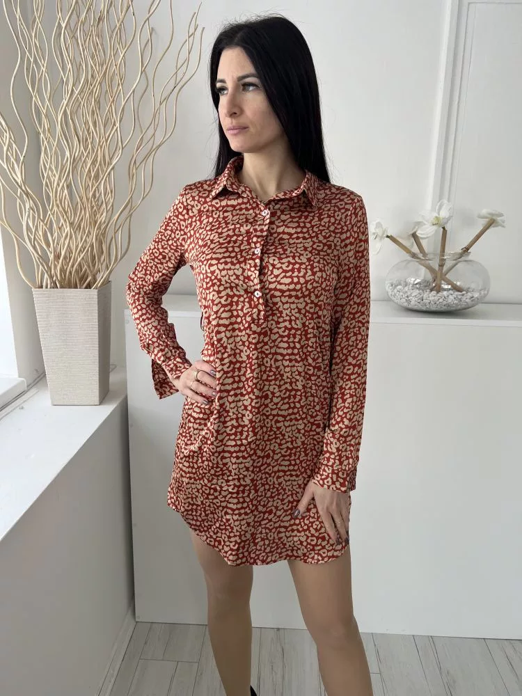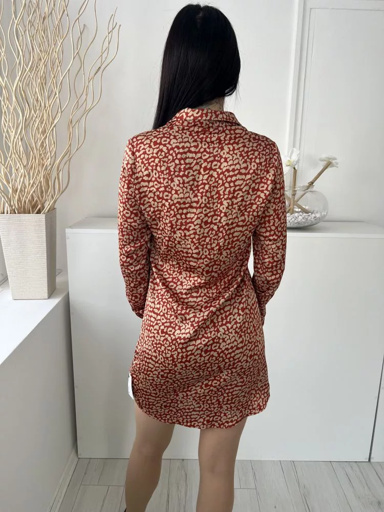 Boohoo (XS) Tégla Drapp Foltmintás, Mellnél Gombos Galléros, Fényes Anyagú Ruha