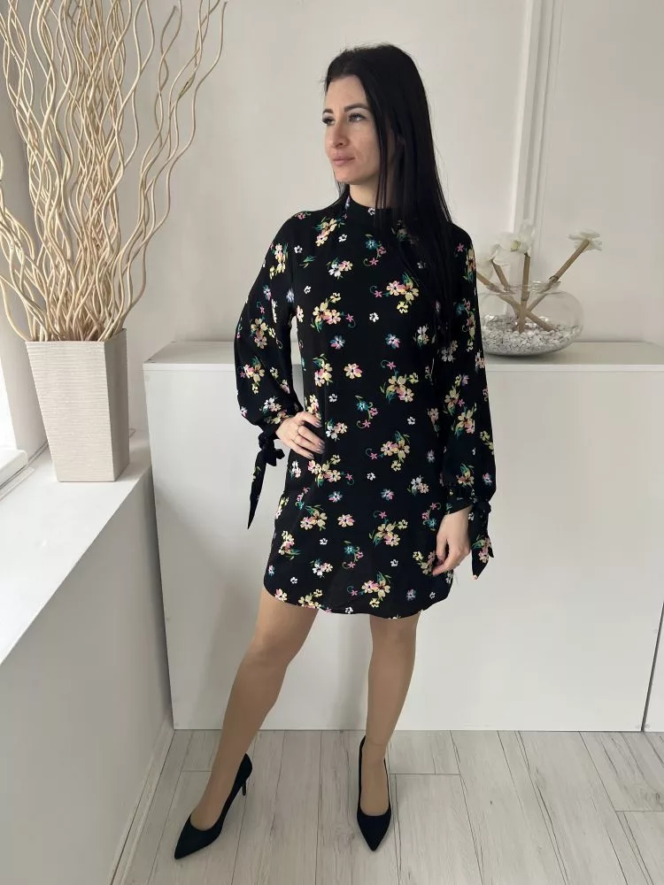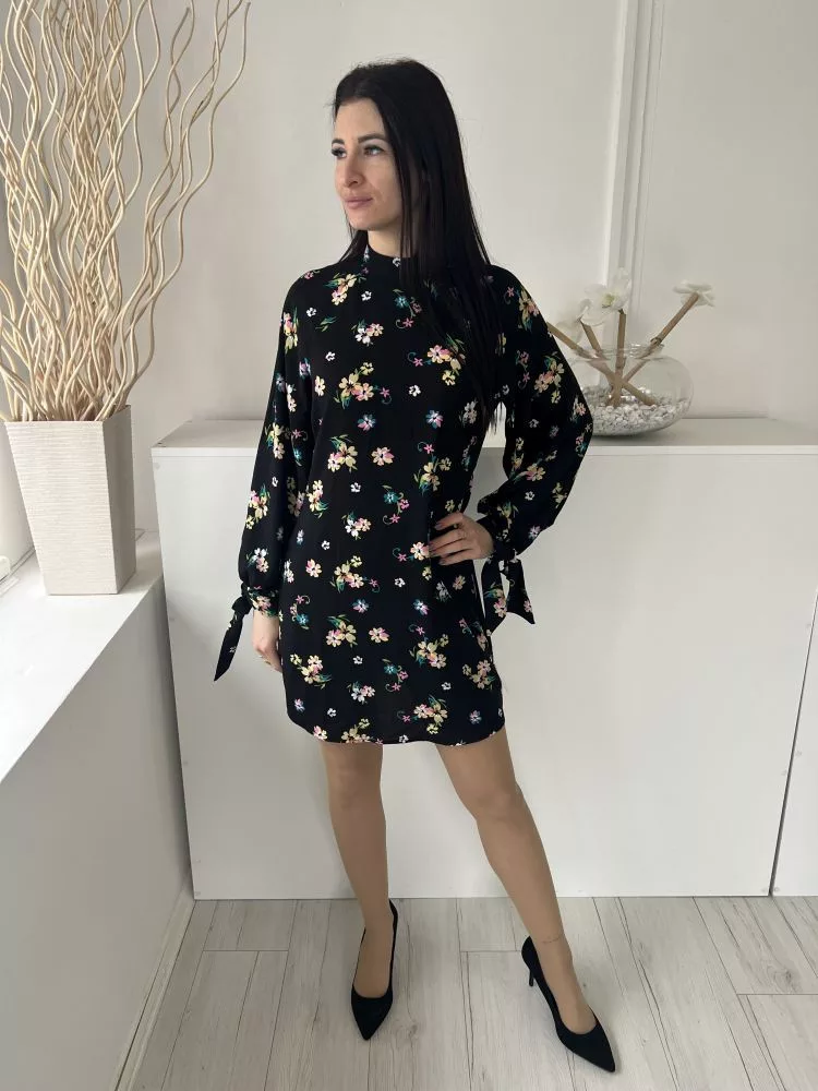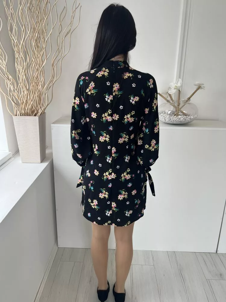 By Very (M) Fekete Színes Virágos, Hátul Cipzáros Ujjvégén Megköthető Ruha