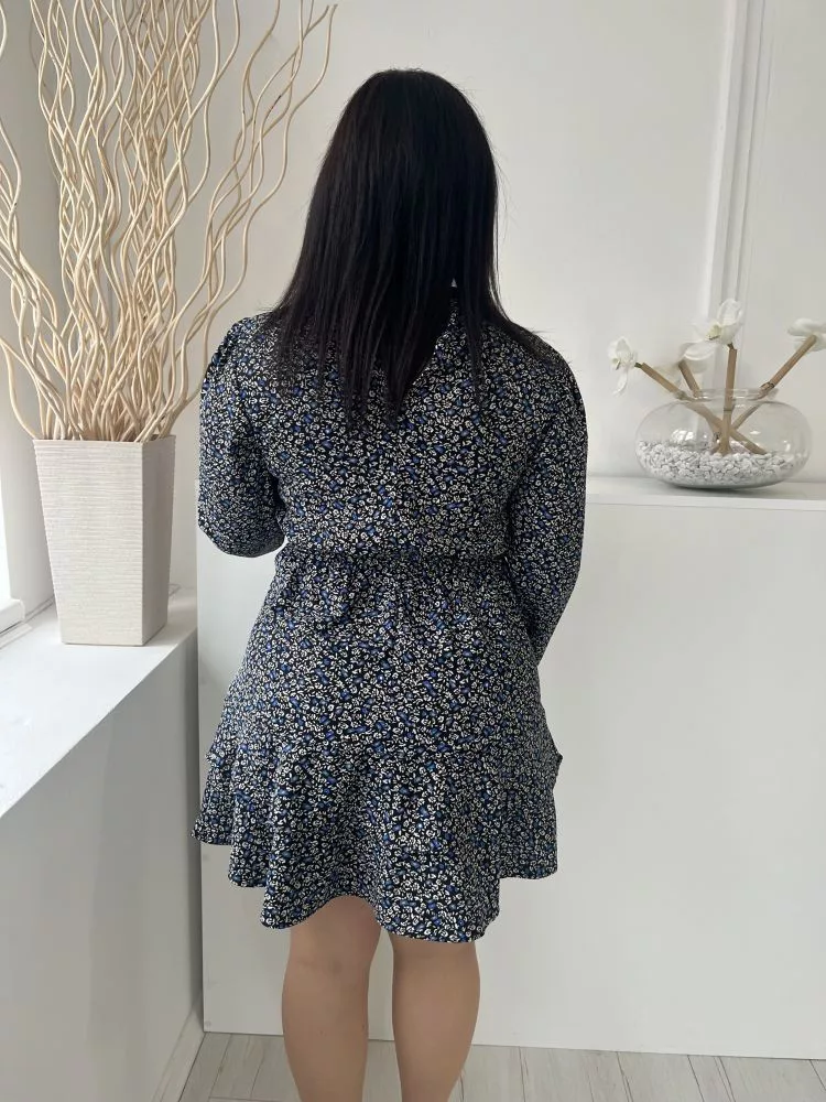Dorothy Perkins (M) Fekete Kék-Fehér Apró Virágos, Hátul Nyakban Gombos Alul Fodros, Magasított Nyakú Ruha