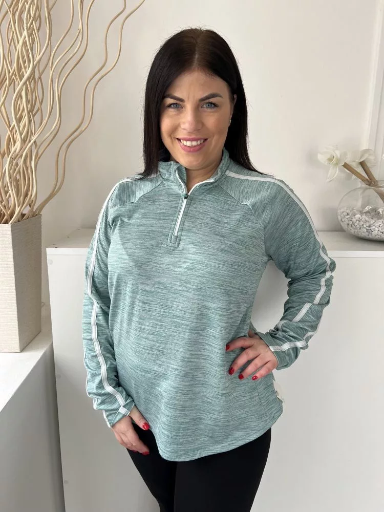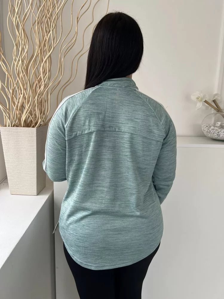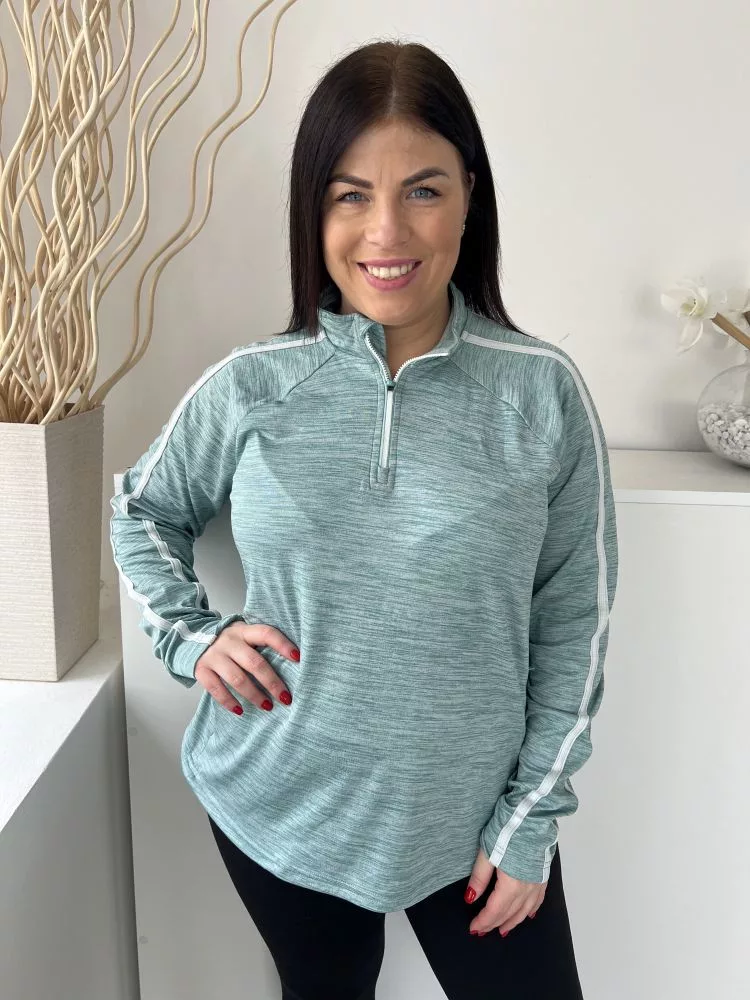 Dunnes (L) Tűrkíz Cirmosmintás, Nyakánál Cipzáros Zsebes, Ujján Fehér Díszcsíkos, Kerekített Aljú Felső