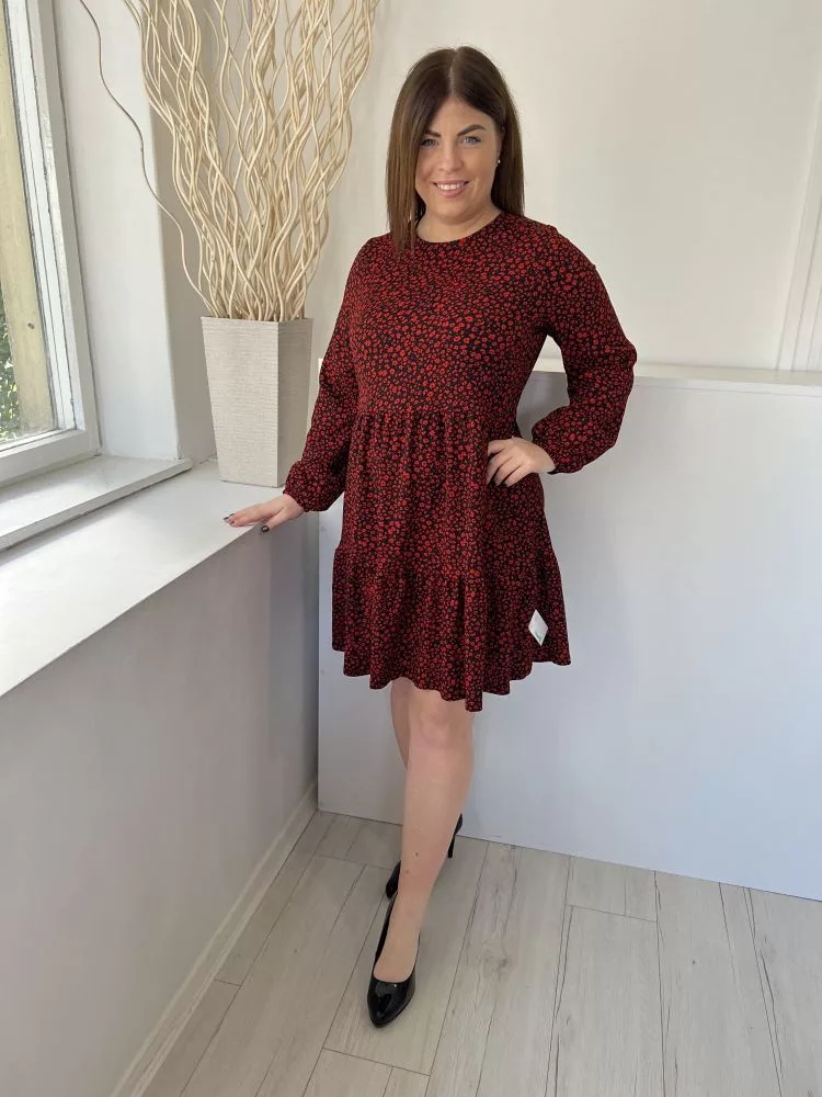 Dunnes (M) Fekete Piros Apró Virágos, Kerek Nyakú Fodros Aljú, Gumis Ujjvégű Ruha