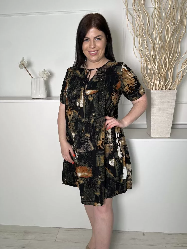 Emery Rose (L) Fekete Barna-Drapp Mintás, Nyakban Megkötős Fodros Aljú, 100% Pamut Ruha