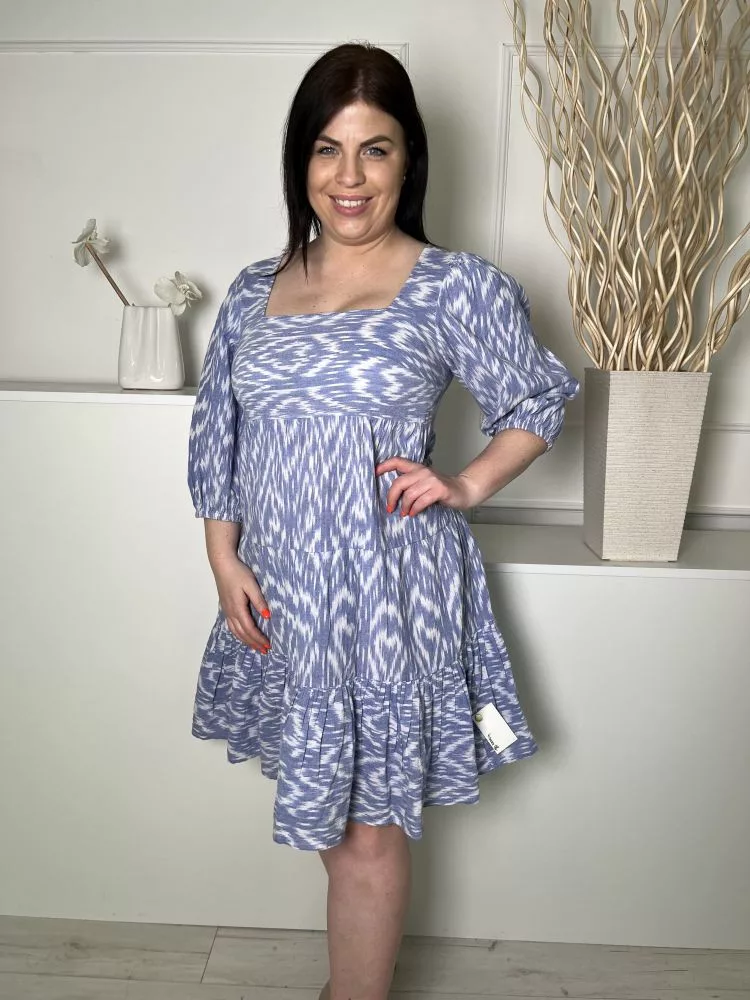 F&F (M) Kék-Fehér Mintás, Buggyos Ujjú, 100% Pamut Hátul Darázsolt, Fodros Aljú Ruha