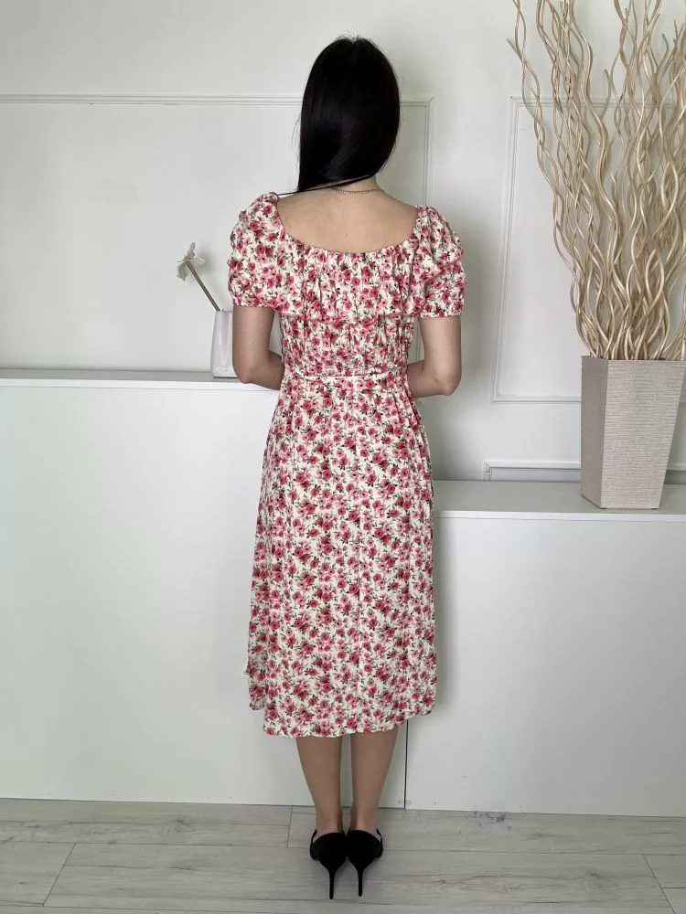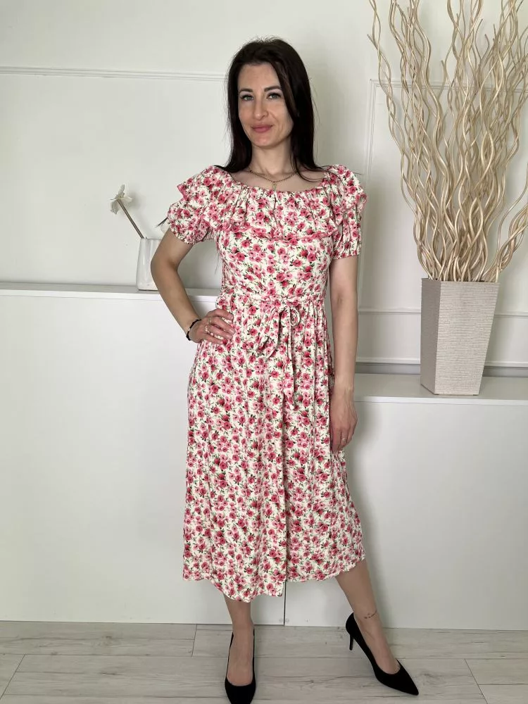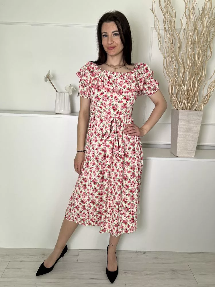 F&F (M) Kmszínű Rózsaszín Virágos, Felül Fodros Szegélyű Derékban Megkötős, Gumis Ujjvégű Ruha