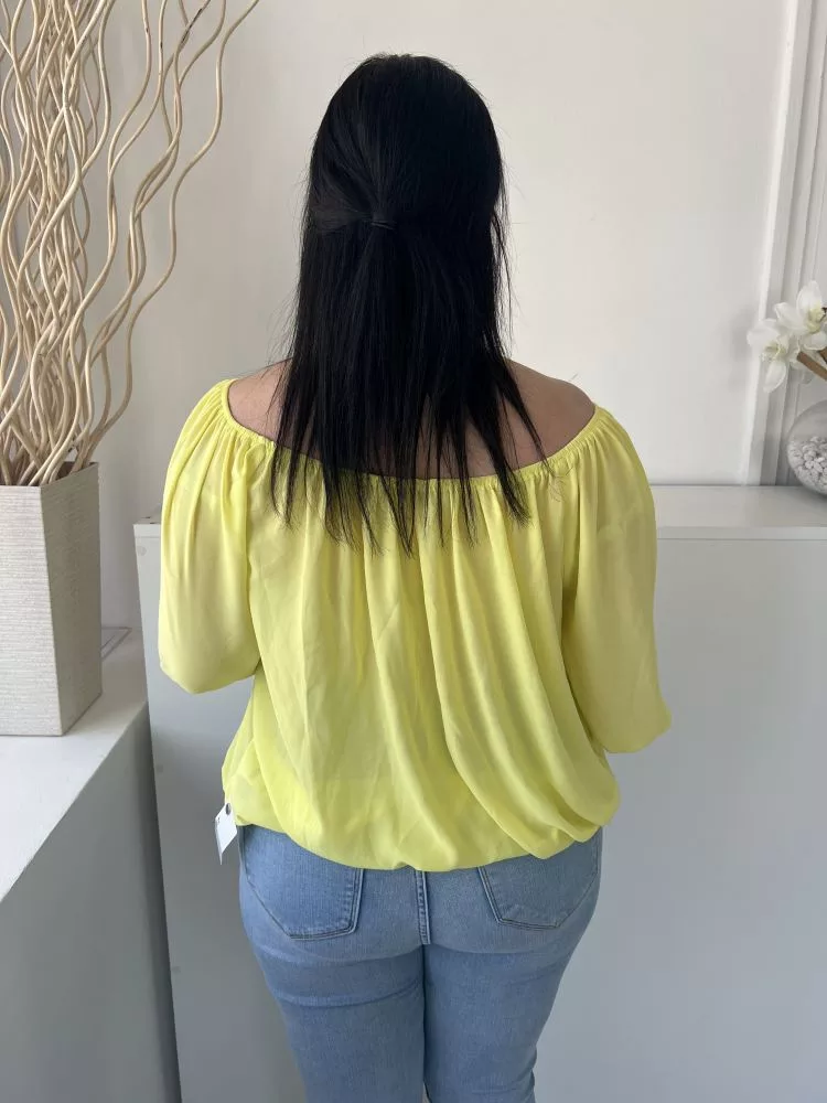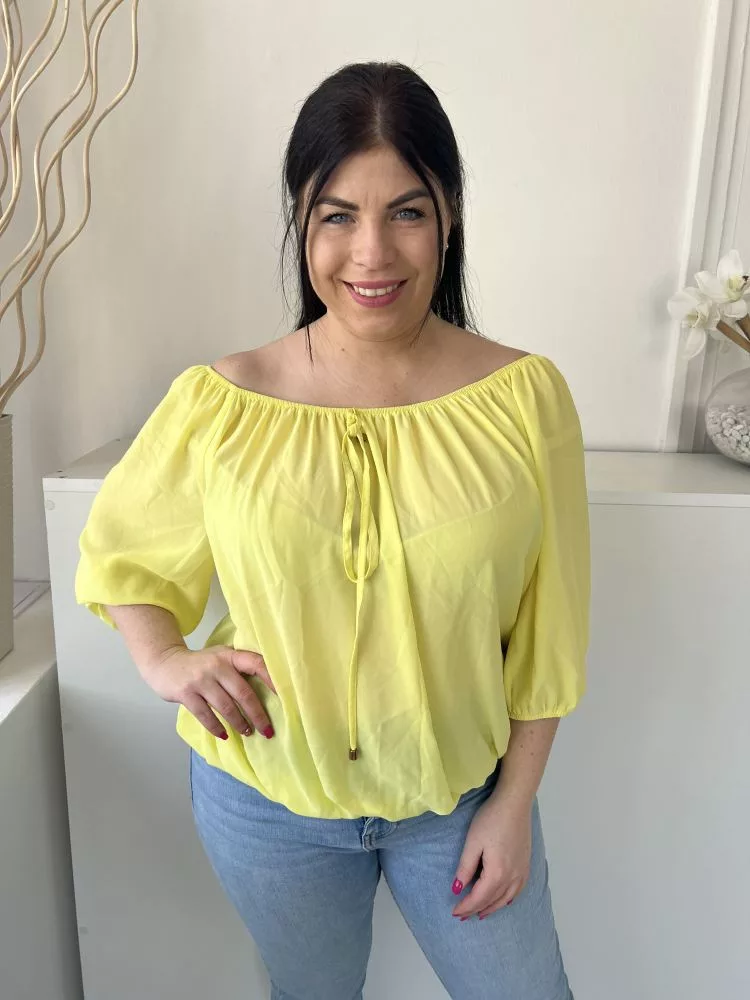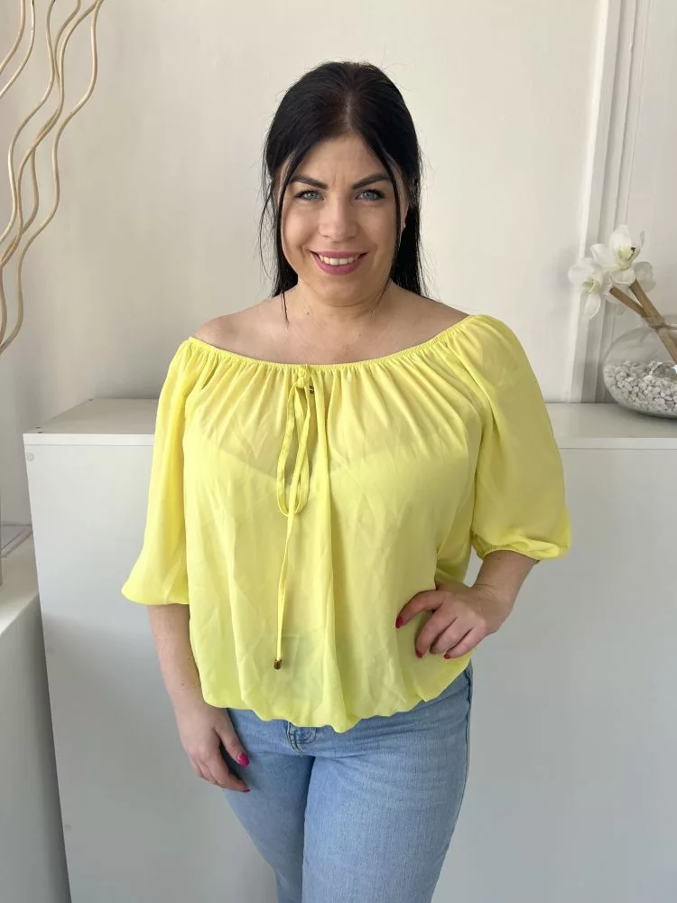 F&F (M) Sárga Ejtett Gumis Vállú, Elől Díszmegkötős Enyhén Áttetsző, Gumisderekú Felső