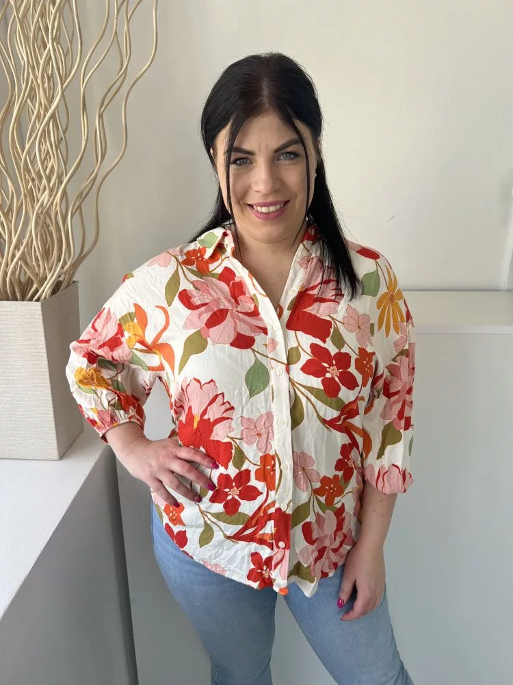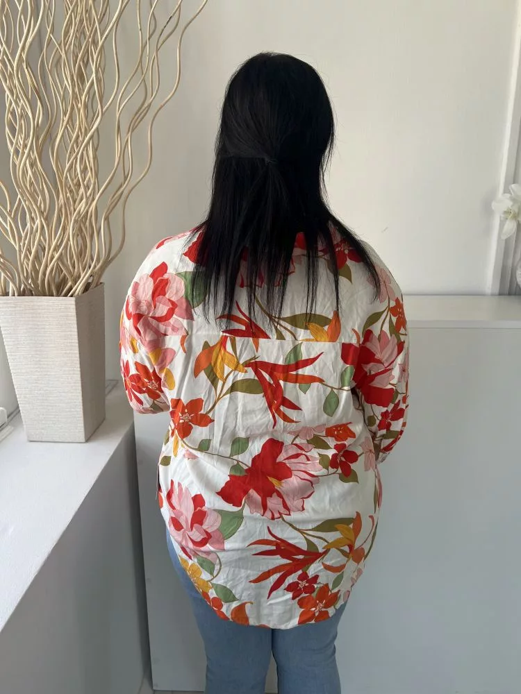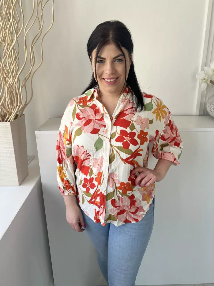 F&F (M) Törtfehér Színes Virágos, Elől Végig Gombos Galléros, Kerekített Aljú Felső