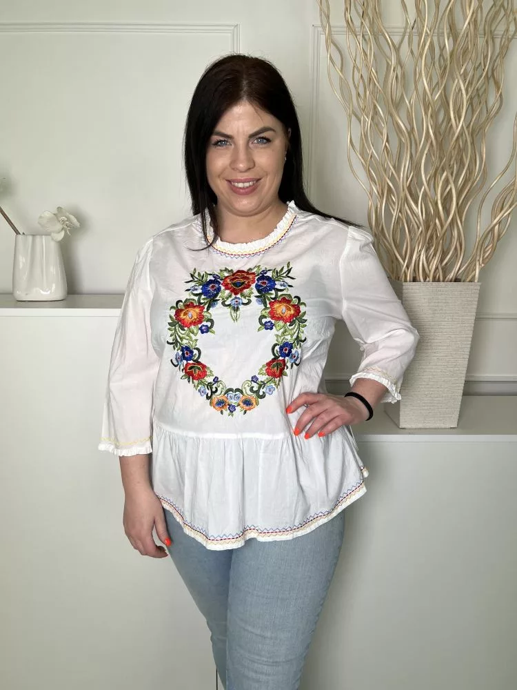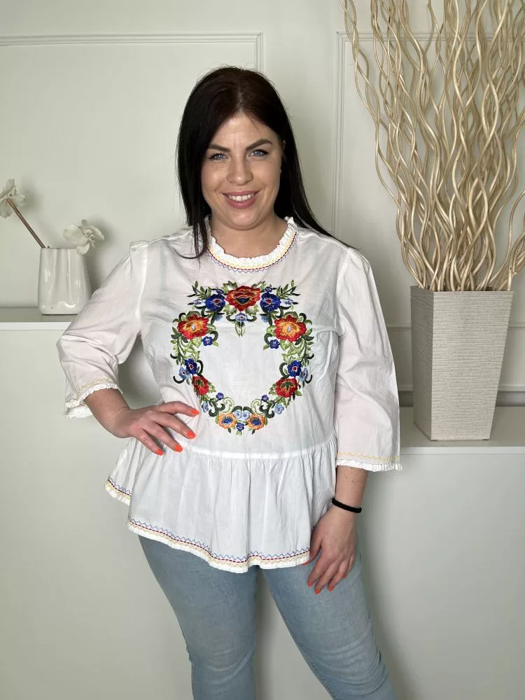 Falmer (XL) Fehér Színes Hímzett Mintás Hátul Nyakban Gombos, 100% Pamut Felső