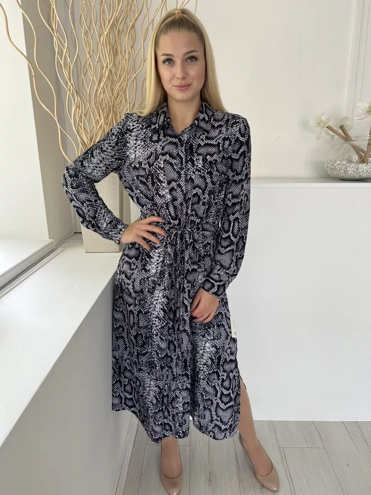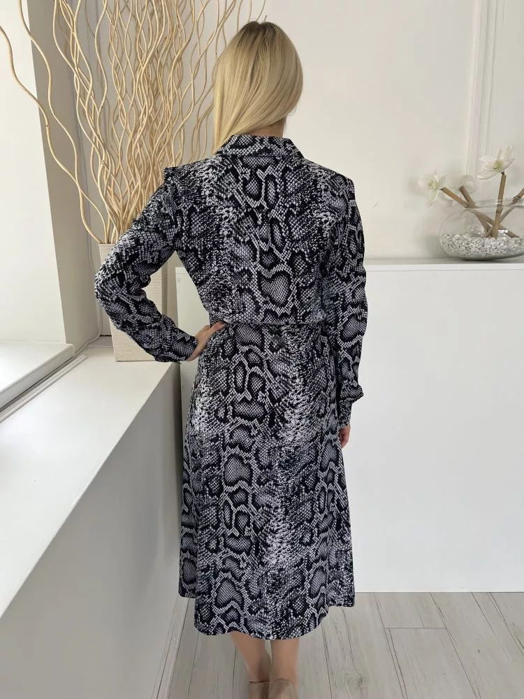 French Conection (M) Szürkéskék-Fekete Kígyóbőrmintás, Elől Végig Gombos Derékban Összehúzható, Oldalt Sliccelt Ruha