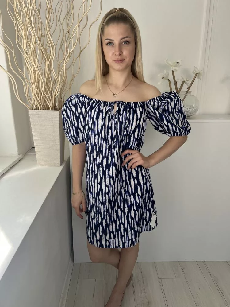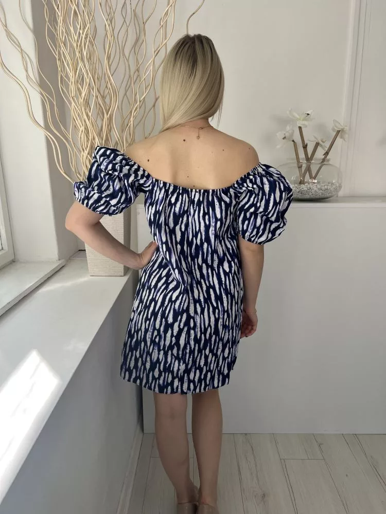 George (M) Indigókék Fehér Mintás, Ejtett Gumis Vállú Mellnél Megkötős, Buggyos Ujjú, 100% Pamut Ruha