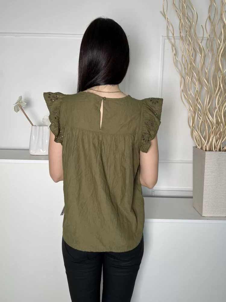 George (S) Khaki Anyagában Lyukacsos Mintás, Fodros Vállú 100% Pamut Alapanyagú, Hátul Nyakban Gombos Felső