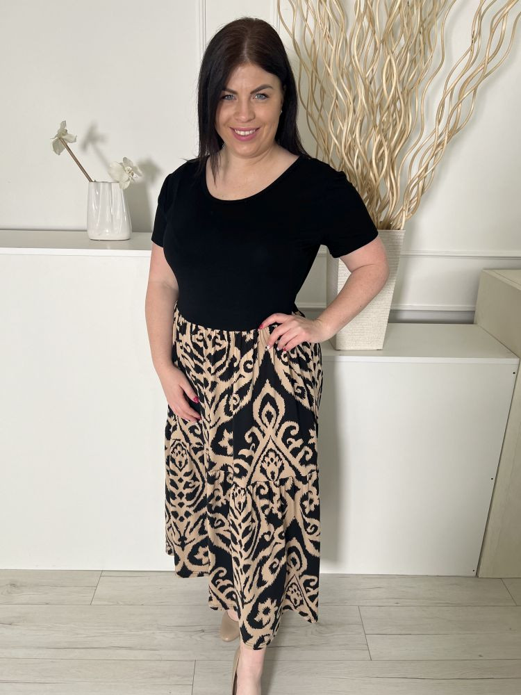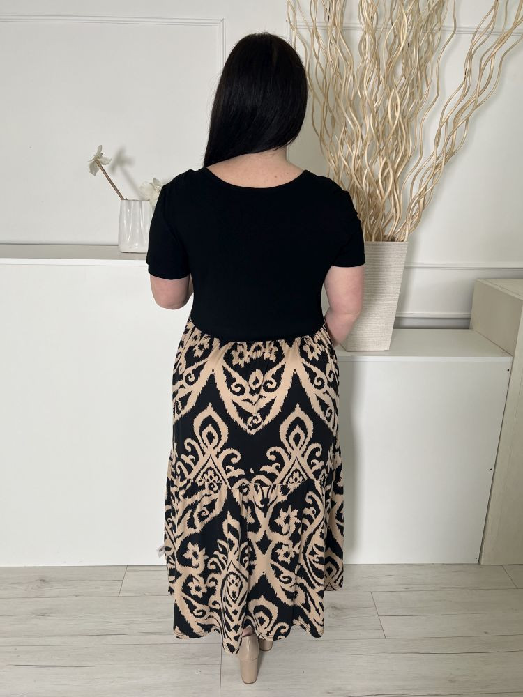 Grecelle (XL) Fekete Szoknyarészén Barna Mintás Kerek Nyakú, Kellemes Anyagú Ruha