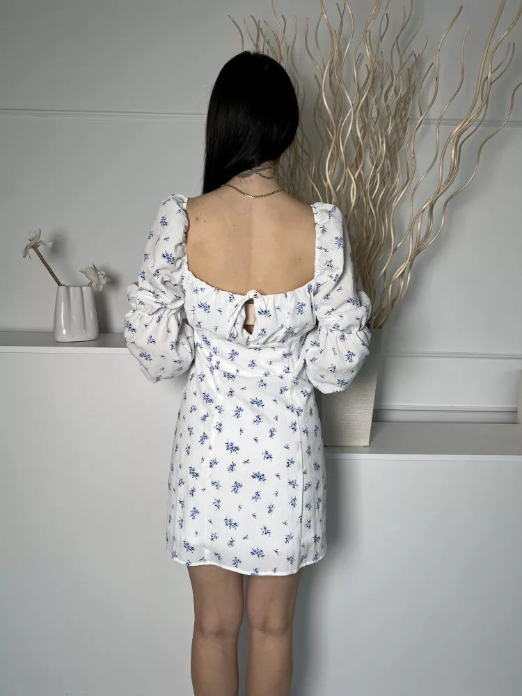H&M (M) Fehér Apró Kék Virágos, Gumírozott Vállú Oldalt Cipzáros, Mellnél Megkötős Ruha