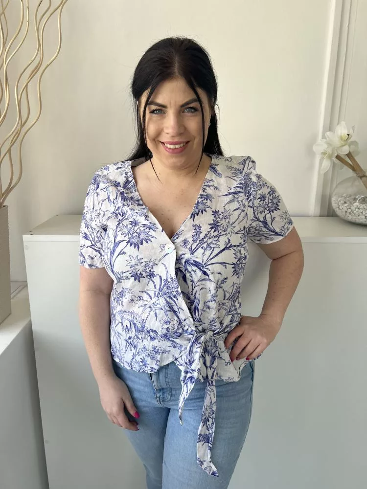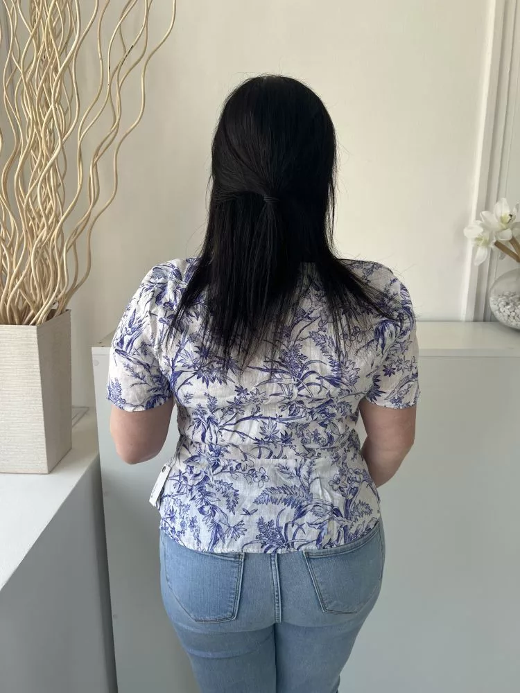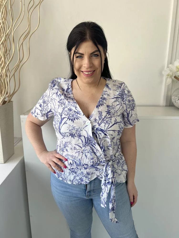 H&M (M) Fehér Kék Mintás, Mellnél Gombos Átlapolt, Oldalt Megkötős, 100% Len Felső