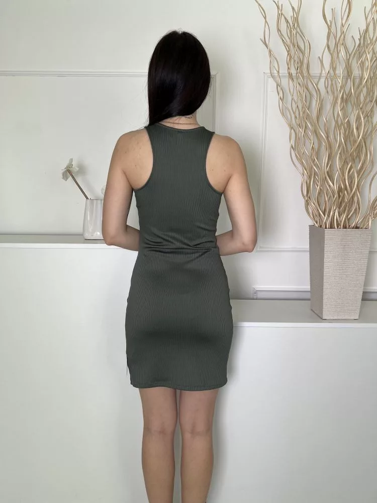 H&M (S) Olajzöld Anyagában Bordázott, Kerek Nyakú Rugalmas Anyagú Ruha