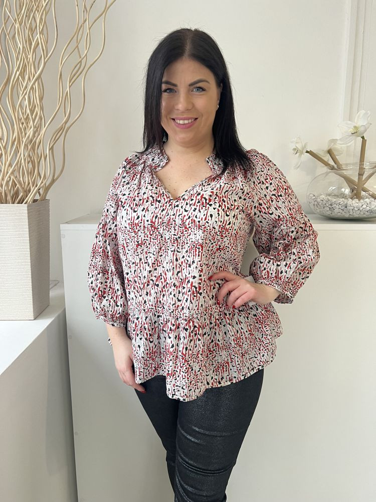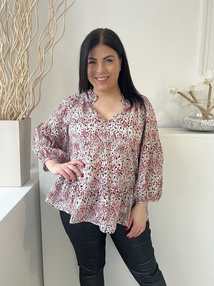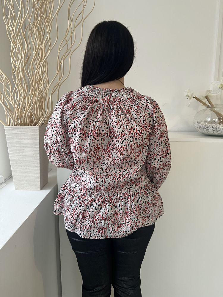 Jigsaw (M) Szürke-Drapp Piros-Fekete Mintás, Derékban Fodros V Kivágású, Buggyos Ujjú Felső