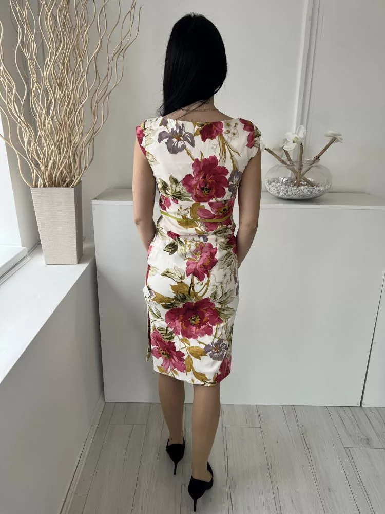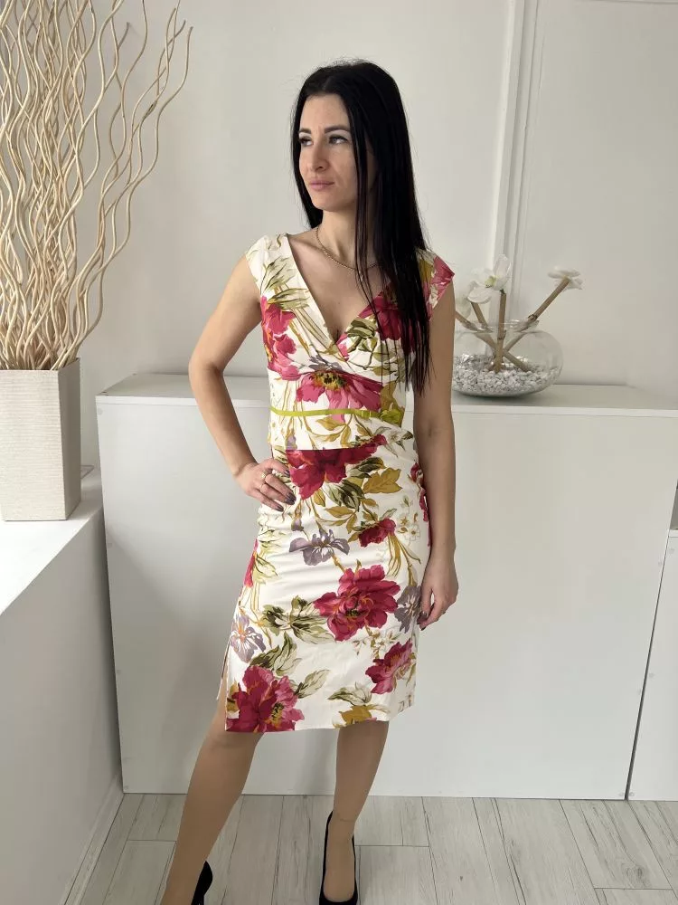 Karen Millen (M) Fehér Színes Virágos, Oldalt Cipzáros Sliccelt, V Kivágású Ruha