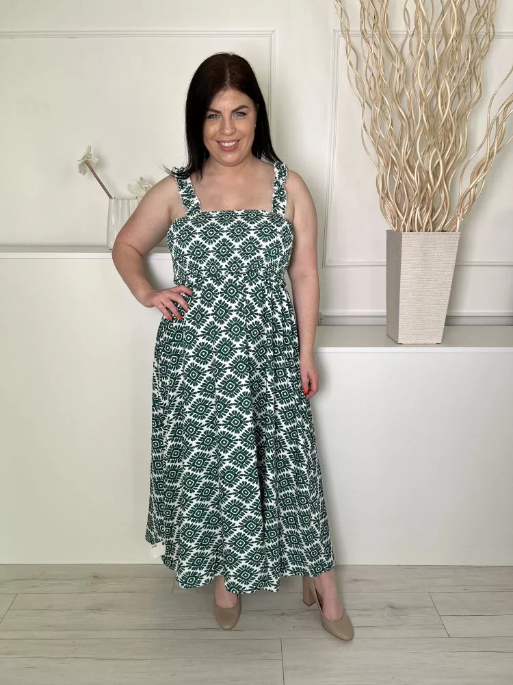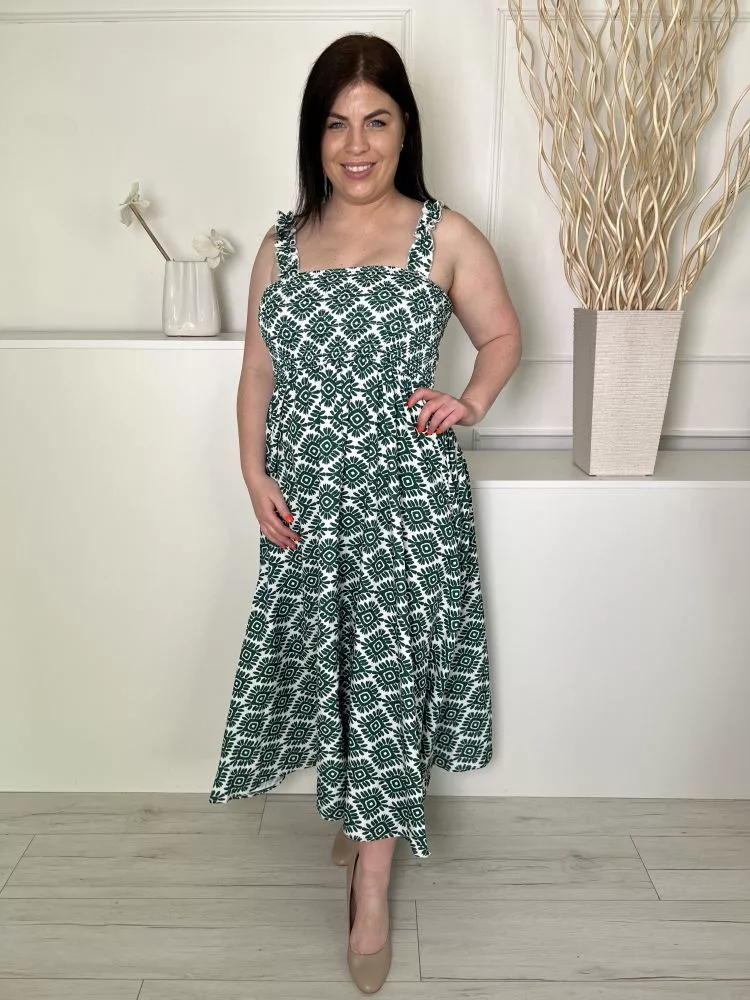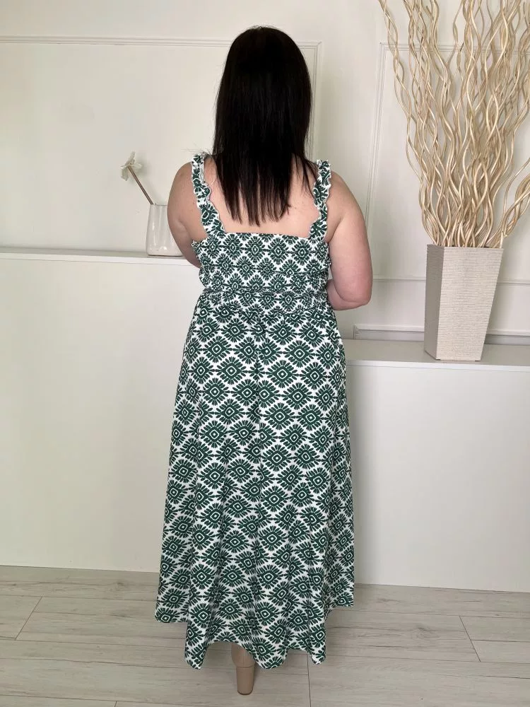(L) Fehér Zöld Mintás, Felül Darázsolt Fodros Pántú Ruha