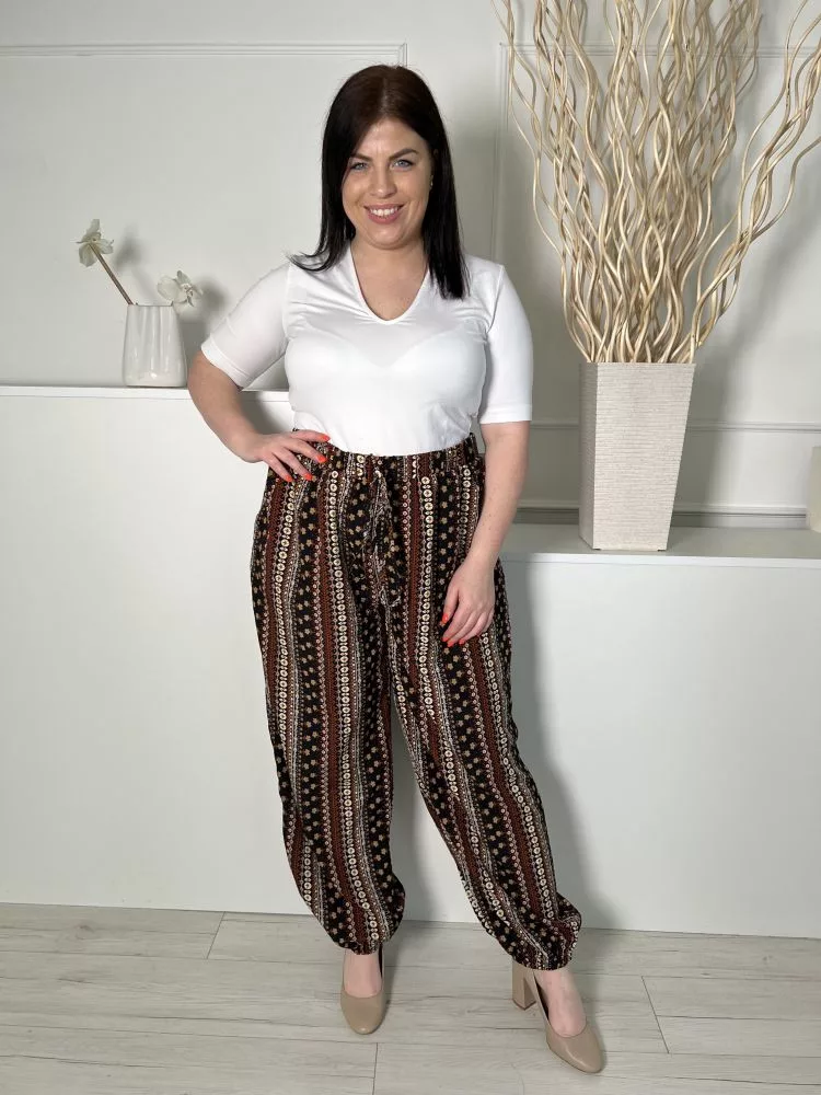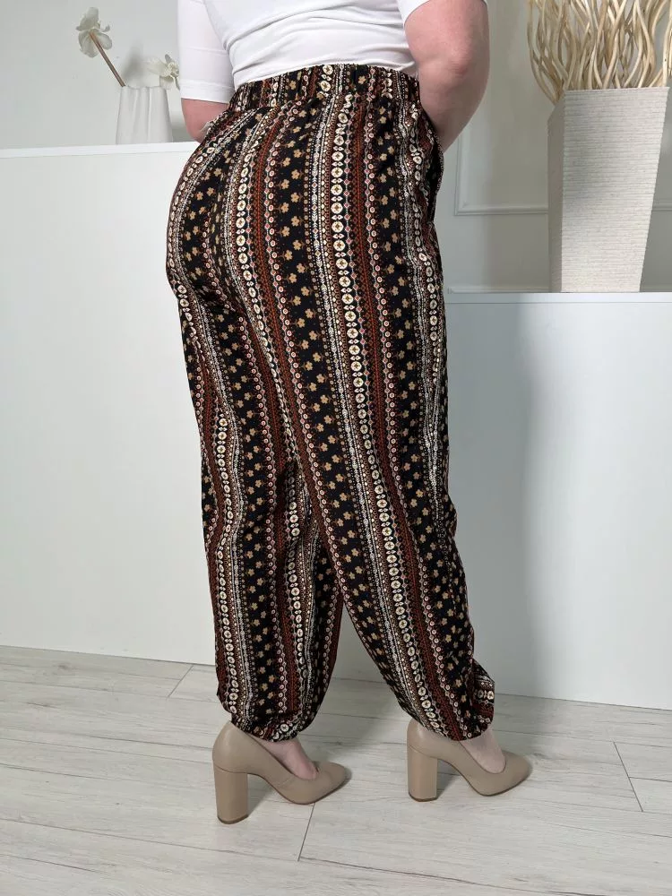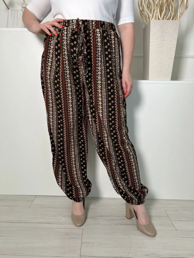 (L) Fekete Barna-Drapp Mintás, Gumisderekú Elől Díszmegkötős, Gumírozott Aljú Nadrág
