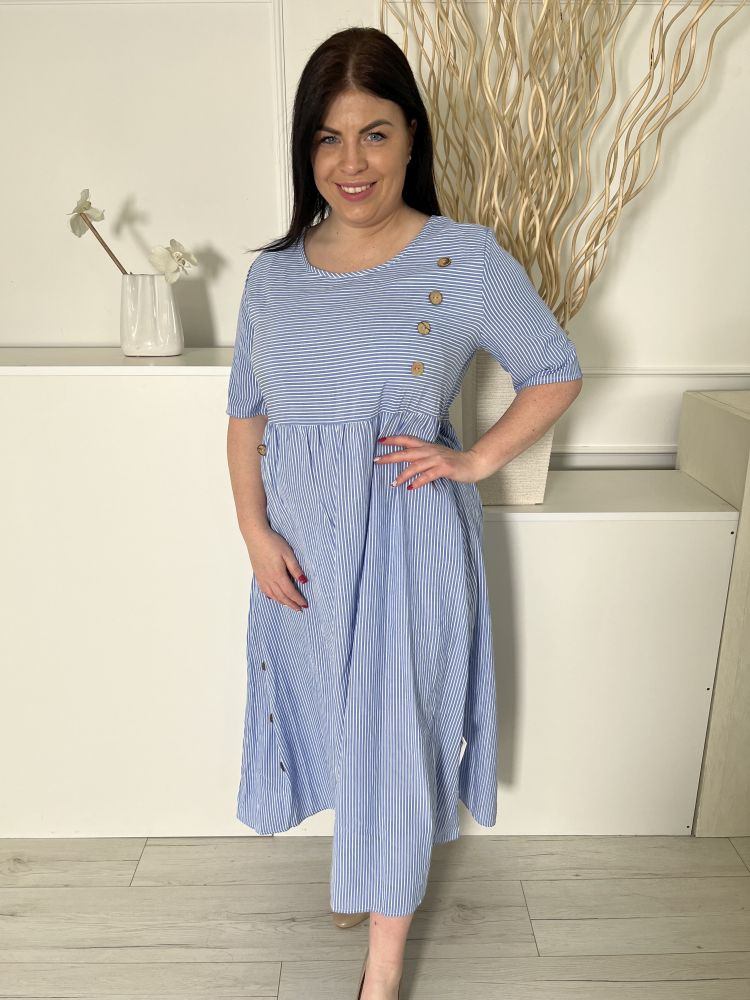 (L) Kék Fehér Csíkos, Díszgombos Derékban Szabott, 100% Pamut Ruha