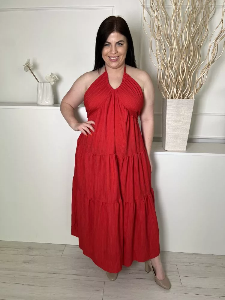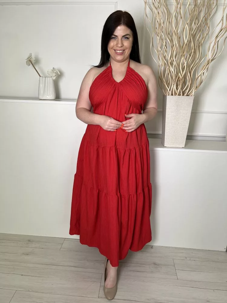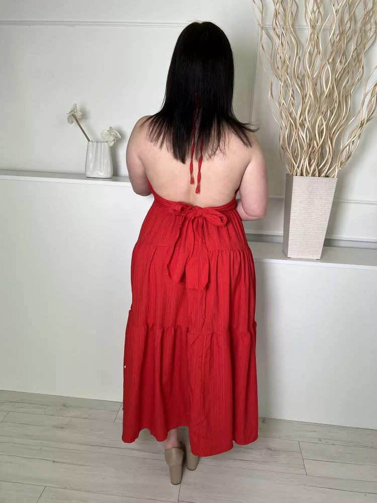 (L) Piros Hátul Megkötős, Nyakpántos Anyagában Mintás, Fodros Aljú Ruha