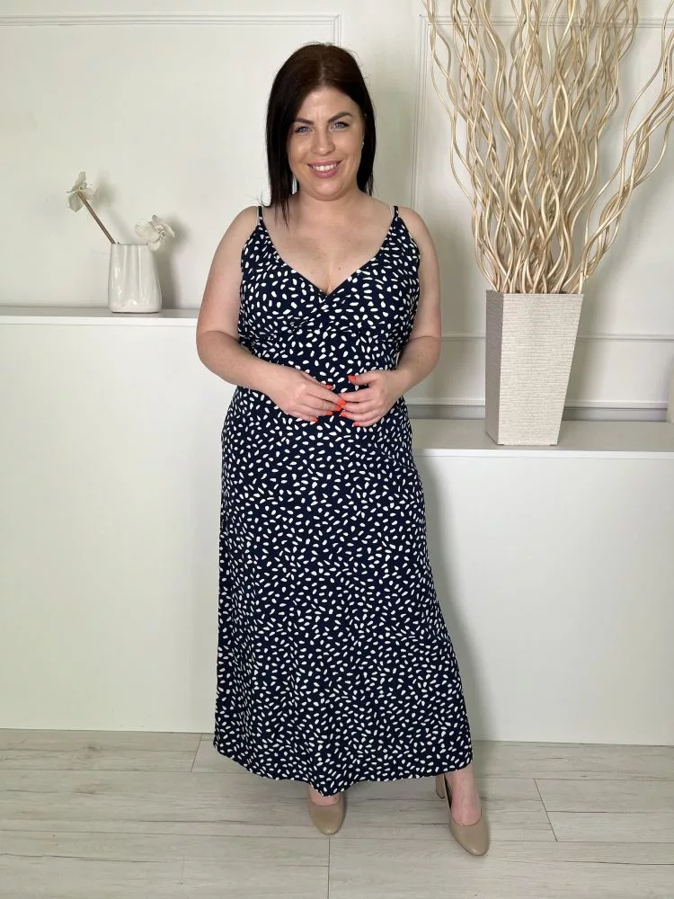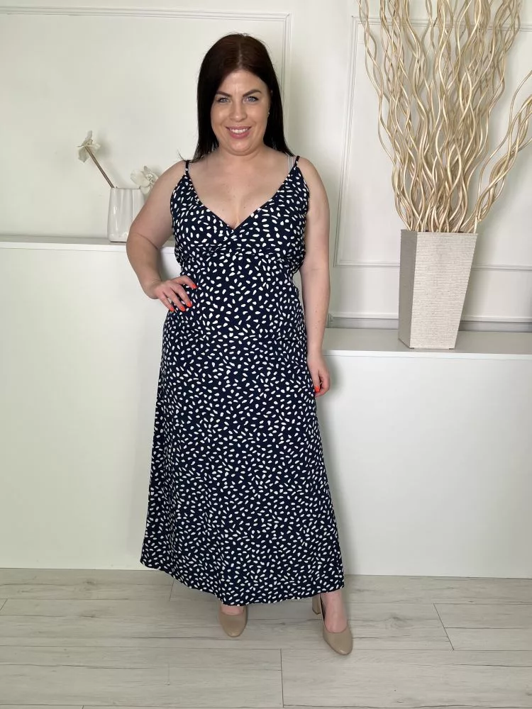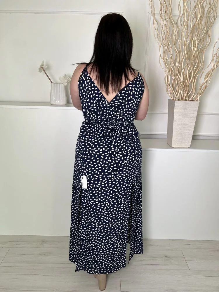 (L) Sötétkék Fehér Foltmintás, Pántos Derékban Megkötős, Oldalt Sliccelt Ruha