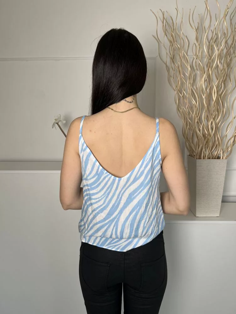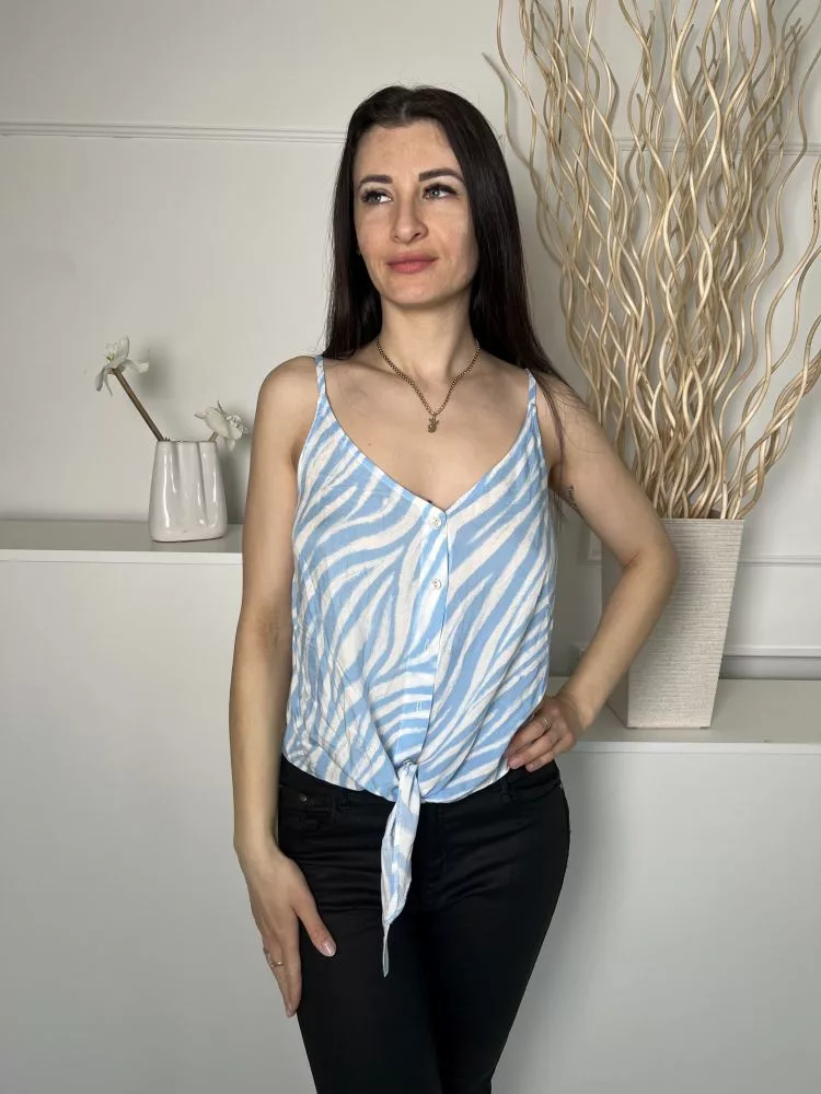 (M) Fehér Kék Tigriscsíkos, Elől Végig Gombos Alul Megkötős, Pántos Felső