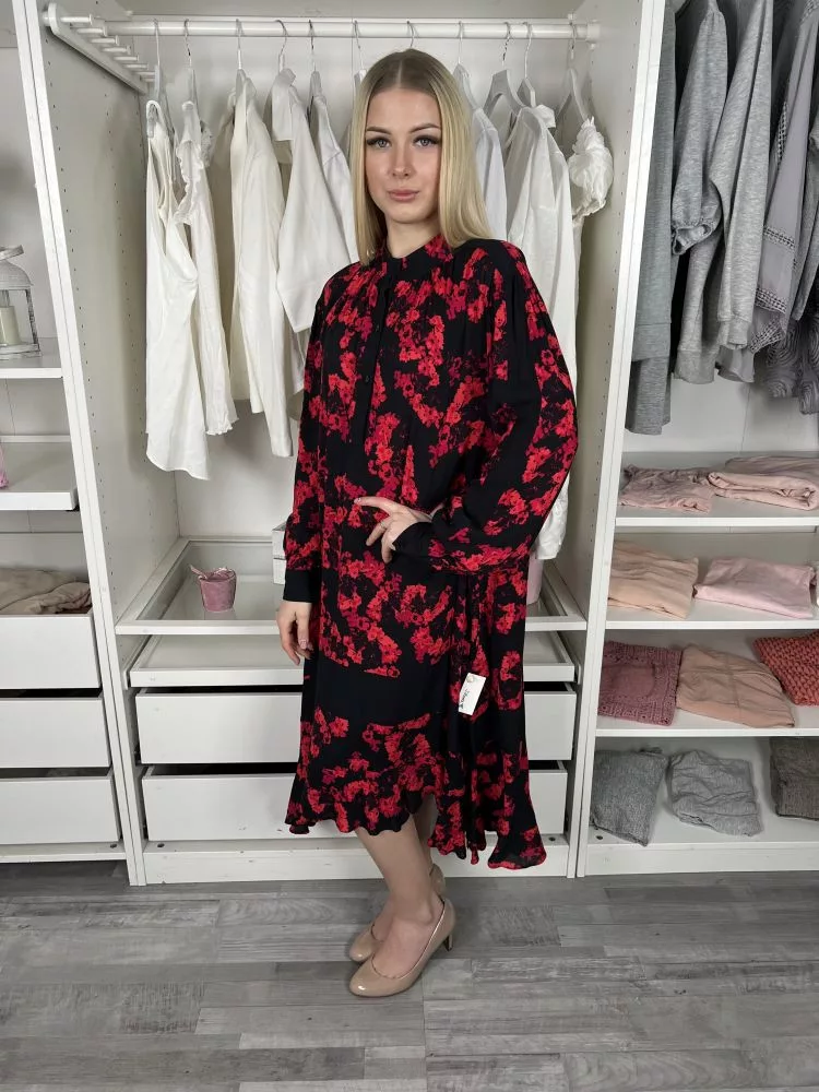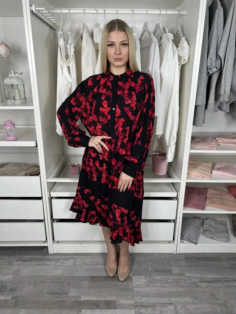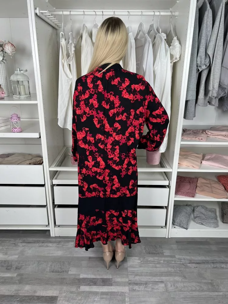 (M) Fekete Piros Virágos, Mellnél Gombos Zsebes, Bőfazonú Ruha
