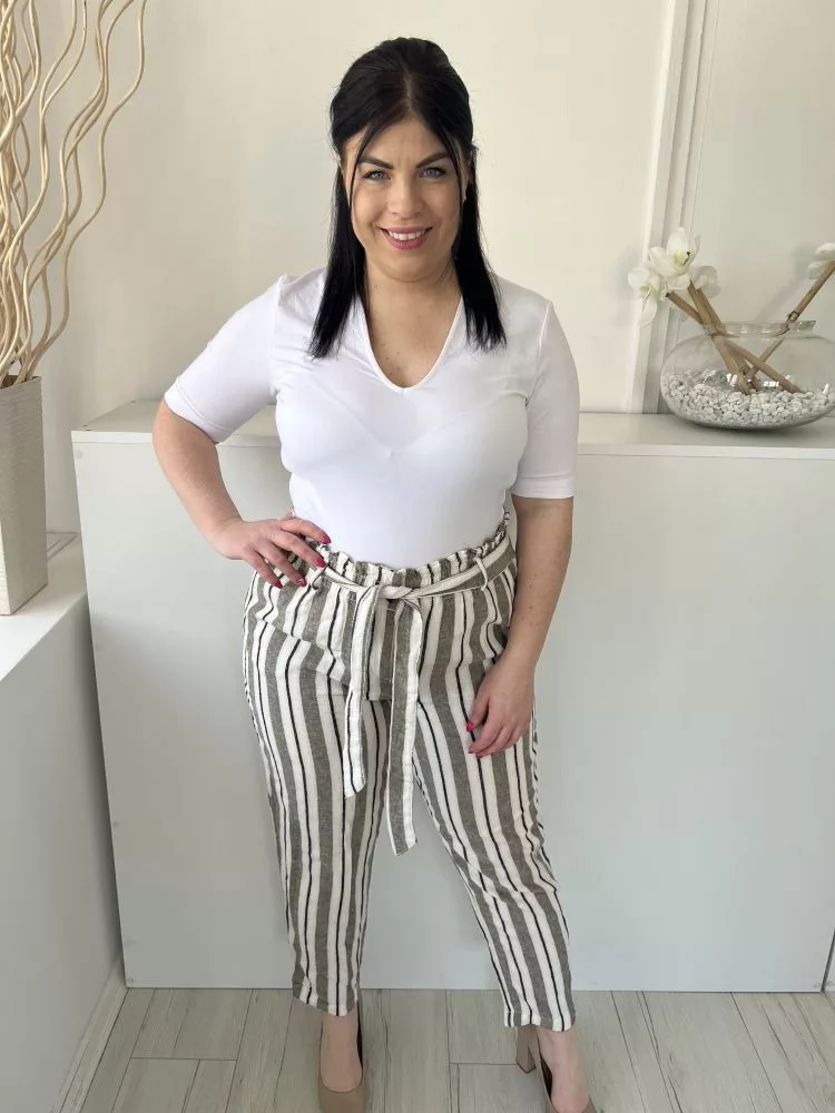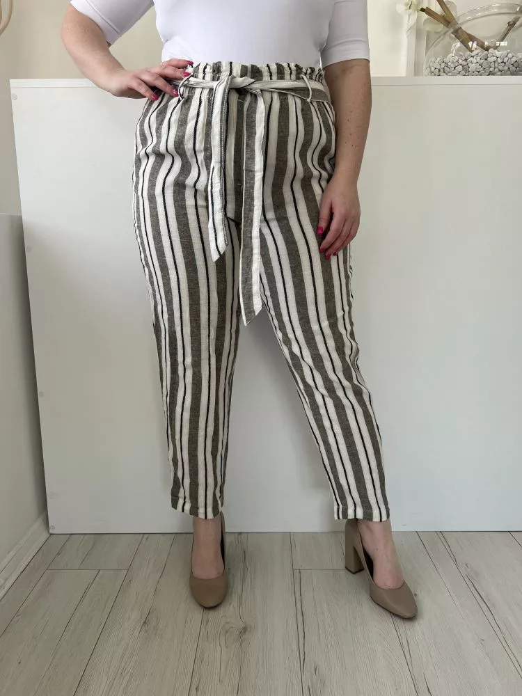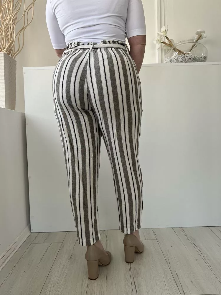 M&Co (L) Fehér Khaki Csíkos, Elől Gombos Derékban Megkötős, 52% Len Alapanyagú Nadrág