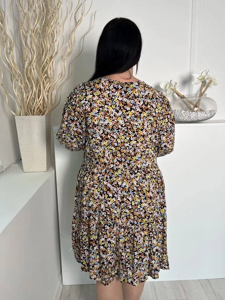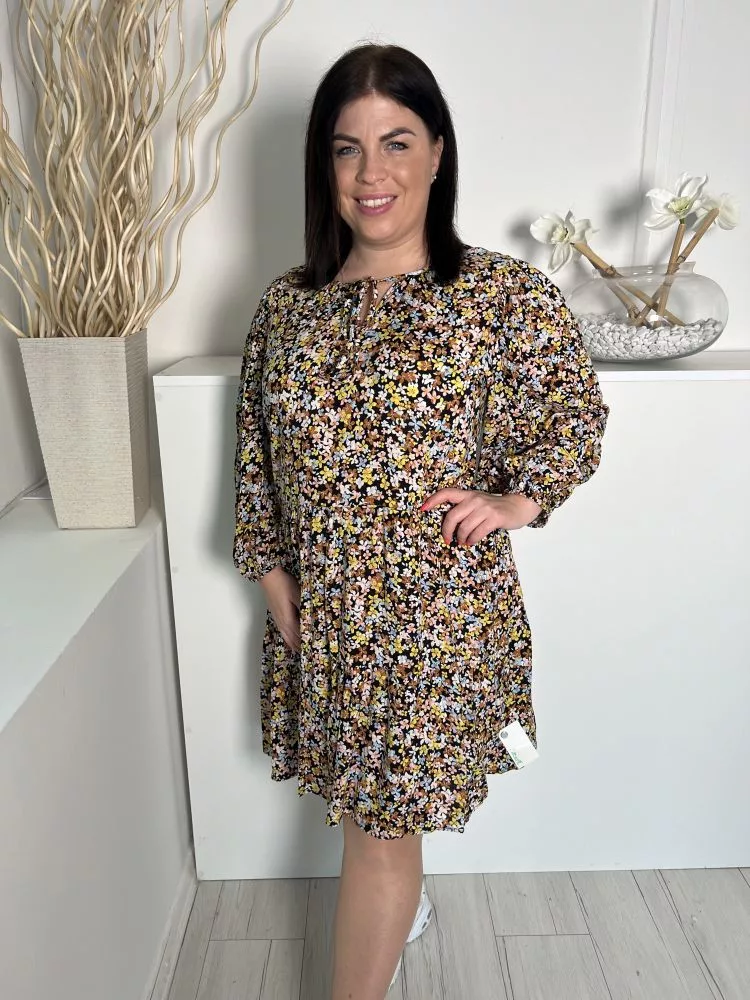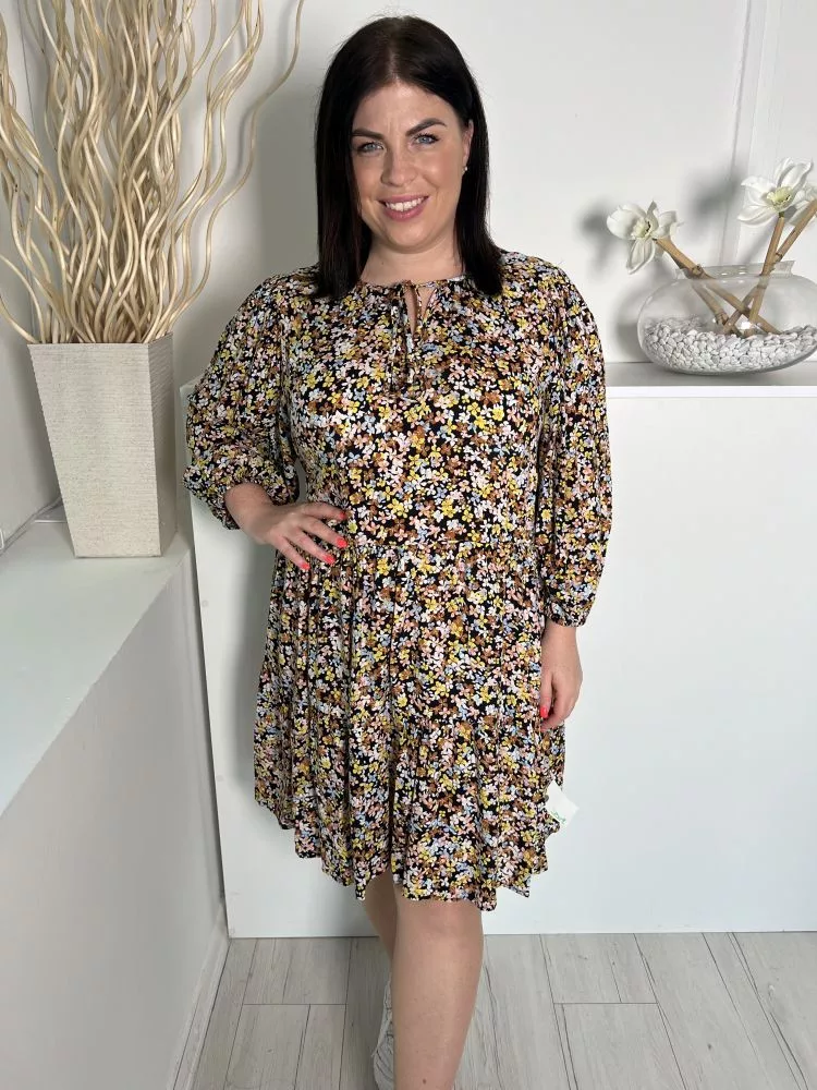 M&Co (L) Fekete Sűrű Színes Virágos, Nyakánál Megköthető Gumis Ujjvégű Ruha