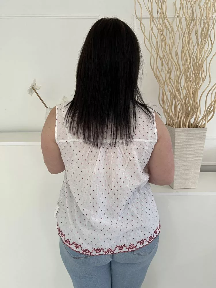 M&Co (M) Fehér Piros Hímzett Mintás, Elől Nyakban Gombos Enyhén Áttetsző, 98% Pamut Alapanyagú Felső