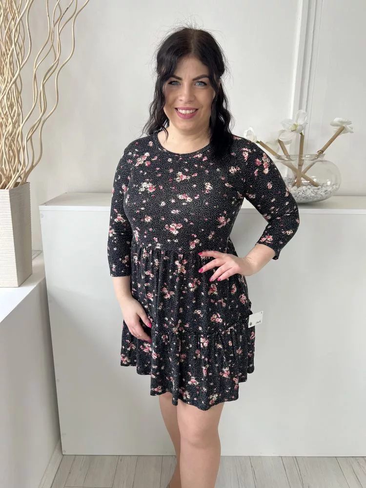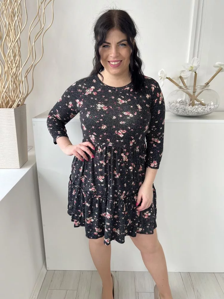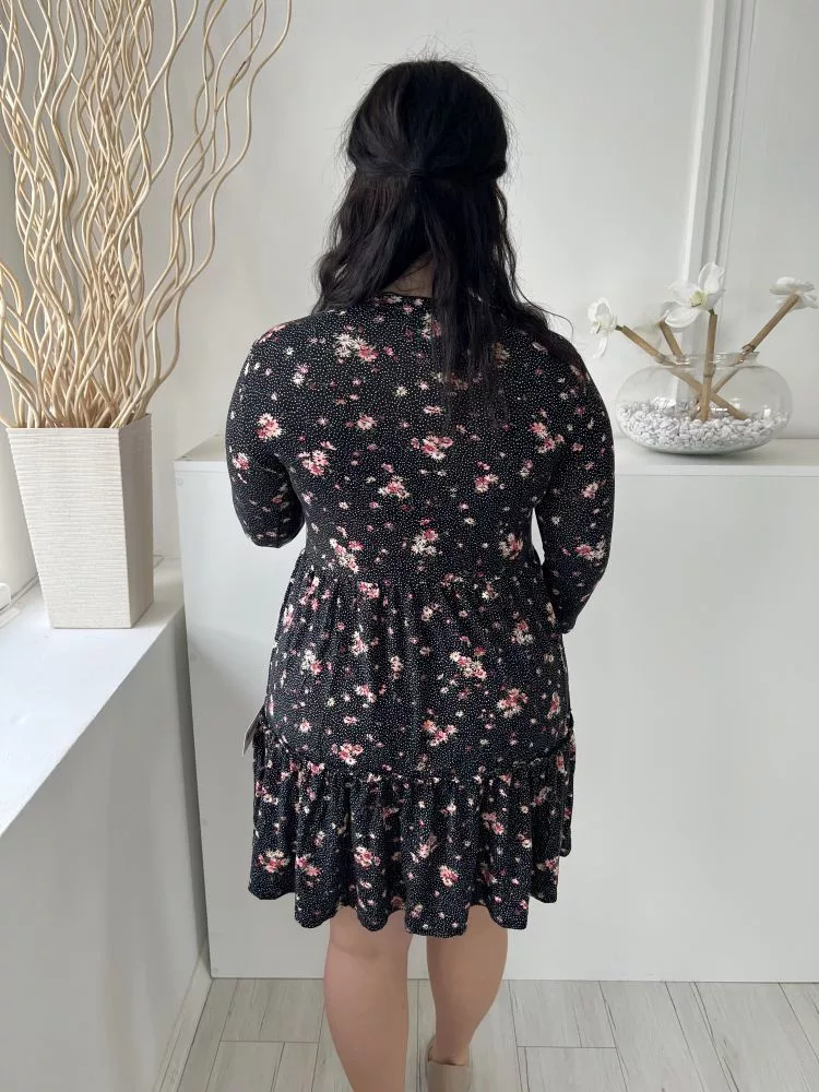 M&Co (M) Fekete Apró Fehér Pöttyös, Virágos Kerek Nyakú, Fodros Aljú Ruha