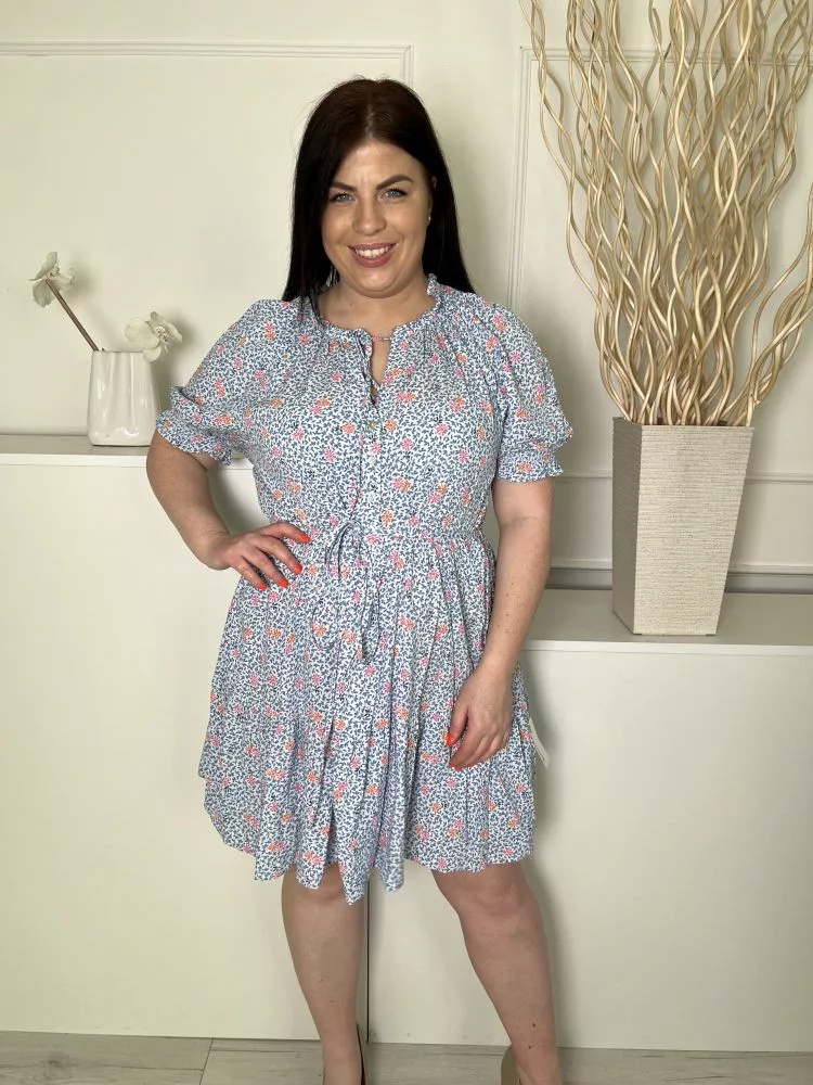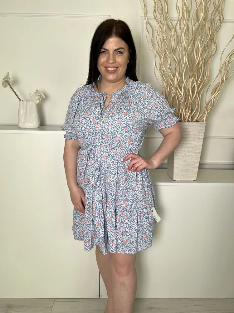 M&S (L) Halványkék Apró Mintás, Nyakban Megköthető Mellnél Gombos, Derékban Megkötős Ruha