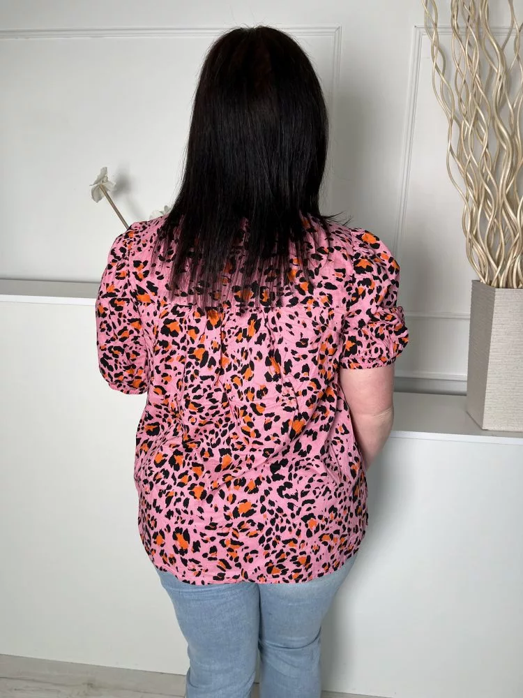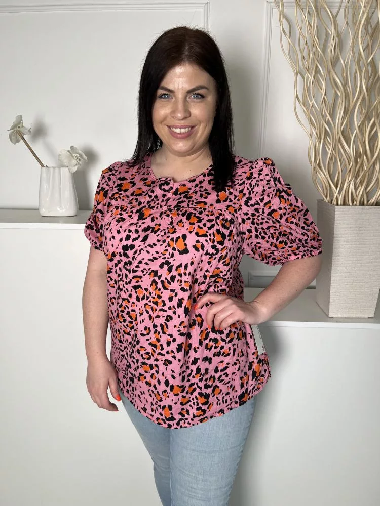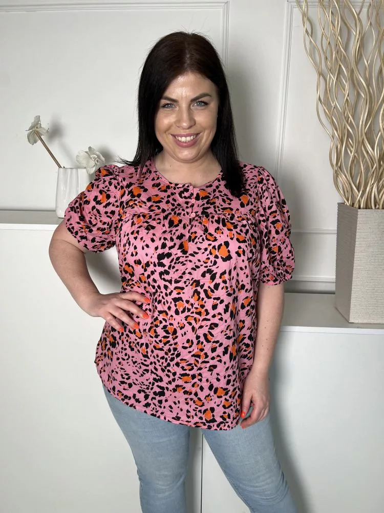 M&S (L) Rózsaszín Fekete-Narancs Foltmintás, 100% Pamut Mellnél Gombos, Gumis Ujjvégű Felső