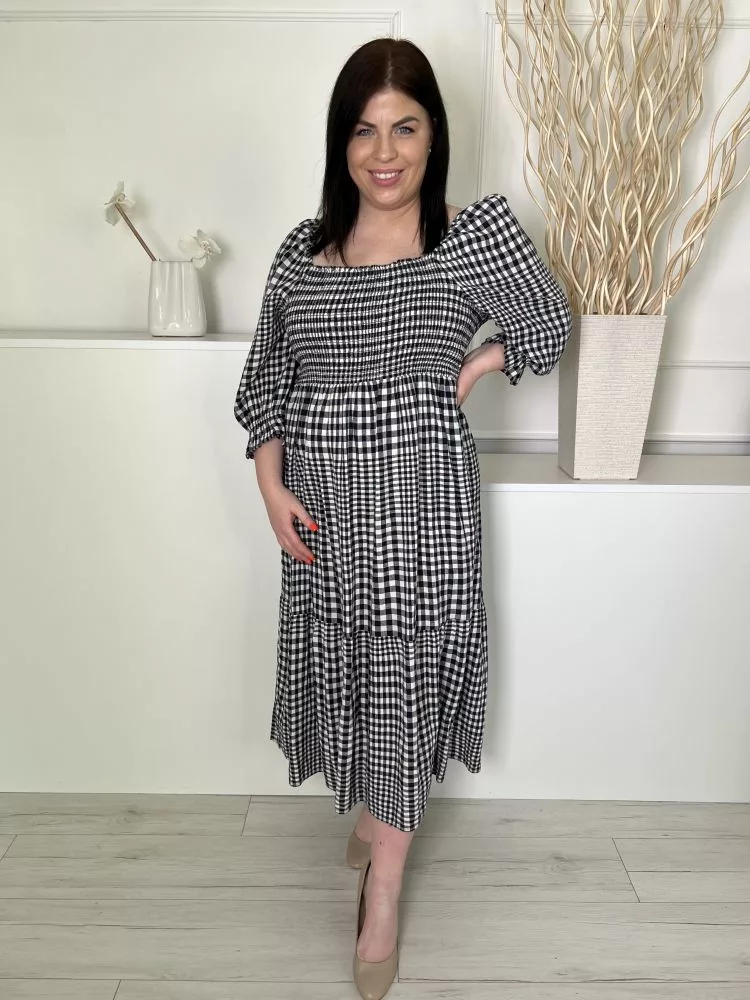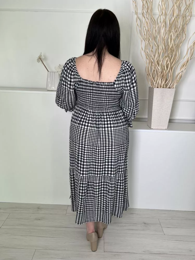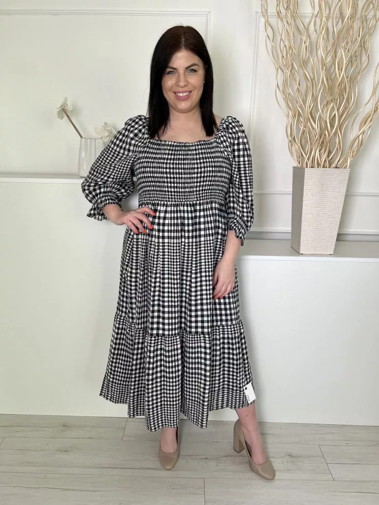 M&S (L) Sötétkék-Fehér Kockás, Buggyos Ujjú, 55% Len Felül Darázsolt, Fodros Aljú Ruha