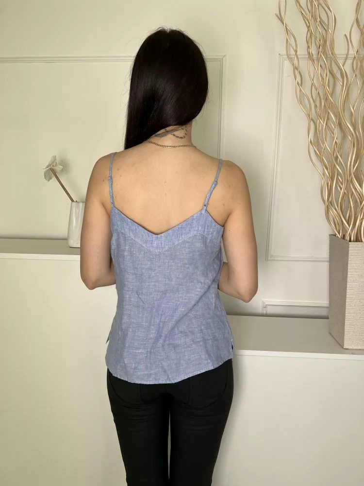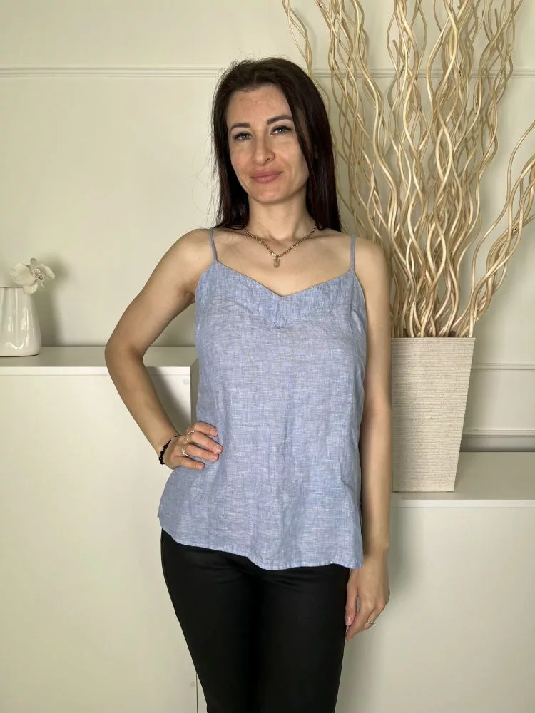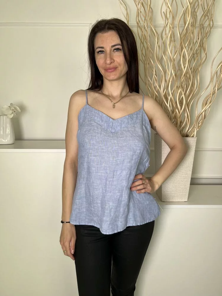 M&S (M) Felhőkék Állítható Pántú Oldalt Gombos, 100% Len Alapanyagú Felső