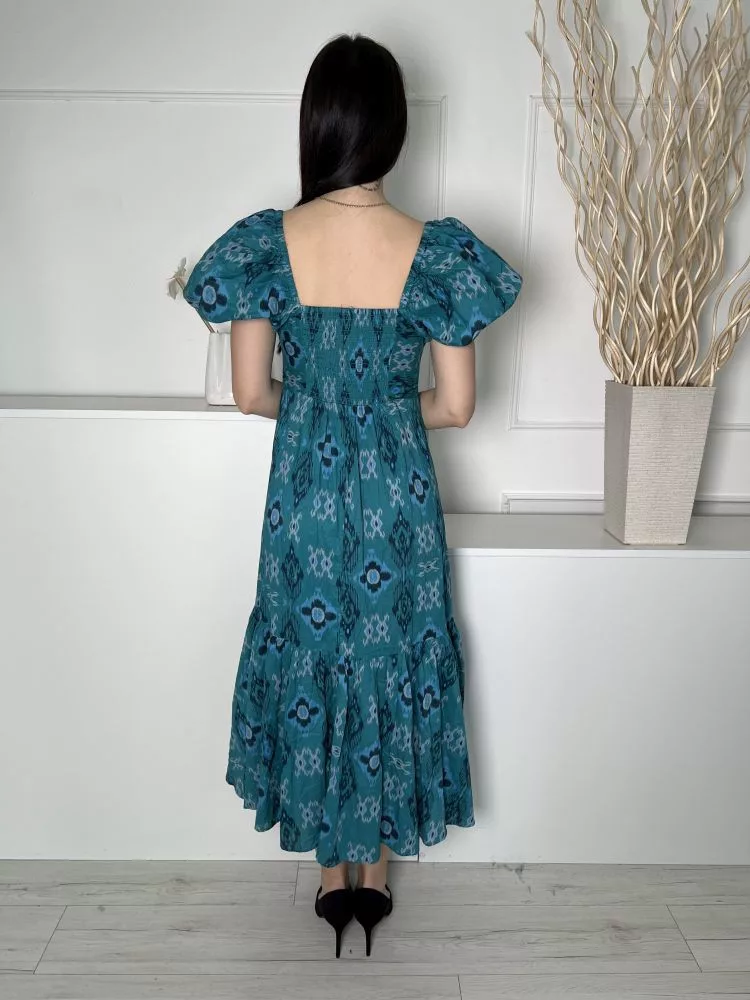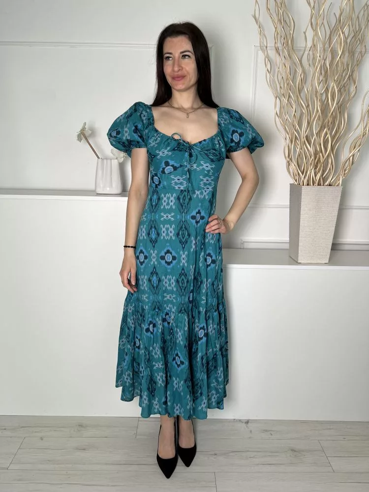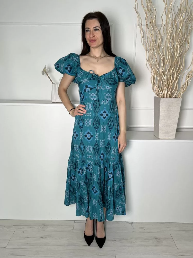 M&S (M) Sötét Tűrkíz Mintás, Mellnél Összehúzható Hátul Darázsolt, Fodros Aljú, 100% Pamut Ruha