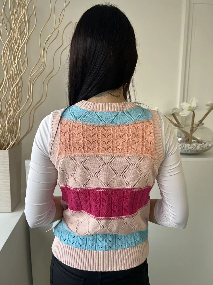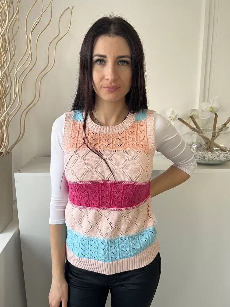 M&S (S) Barack-Pink-Kék Anyagában Lyukacsos, Kerek Nyakú Ujjatlan, Kötött Felső
