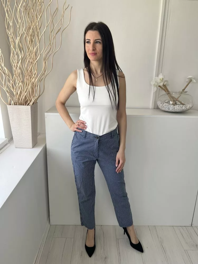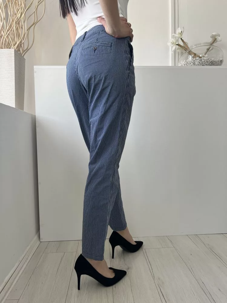 M&S (S) Kék Fehér Mikrocsíkos, Elől Gombos Zsebes, Övtartós Nadrág